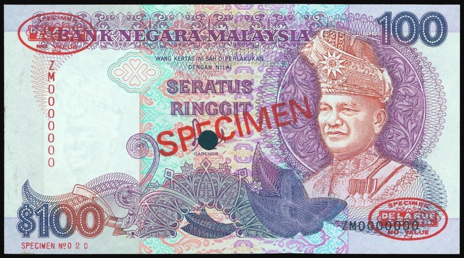 Malaysia, 100 ringgit, specimen, 2nd series type 2 (1986-1995), serial number ZM0000000, purple on multicolour, T.A. Rahman at right, the reverse shows the National Mosque in Kuala Lumpur,