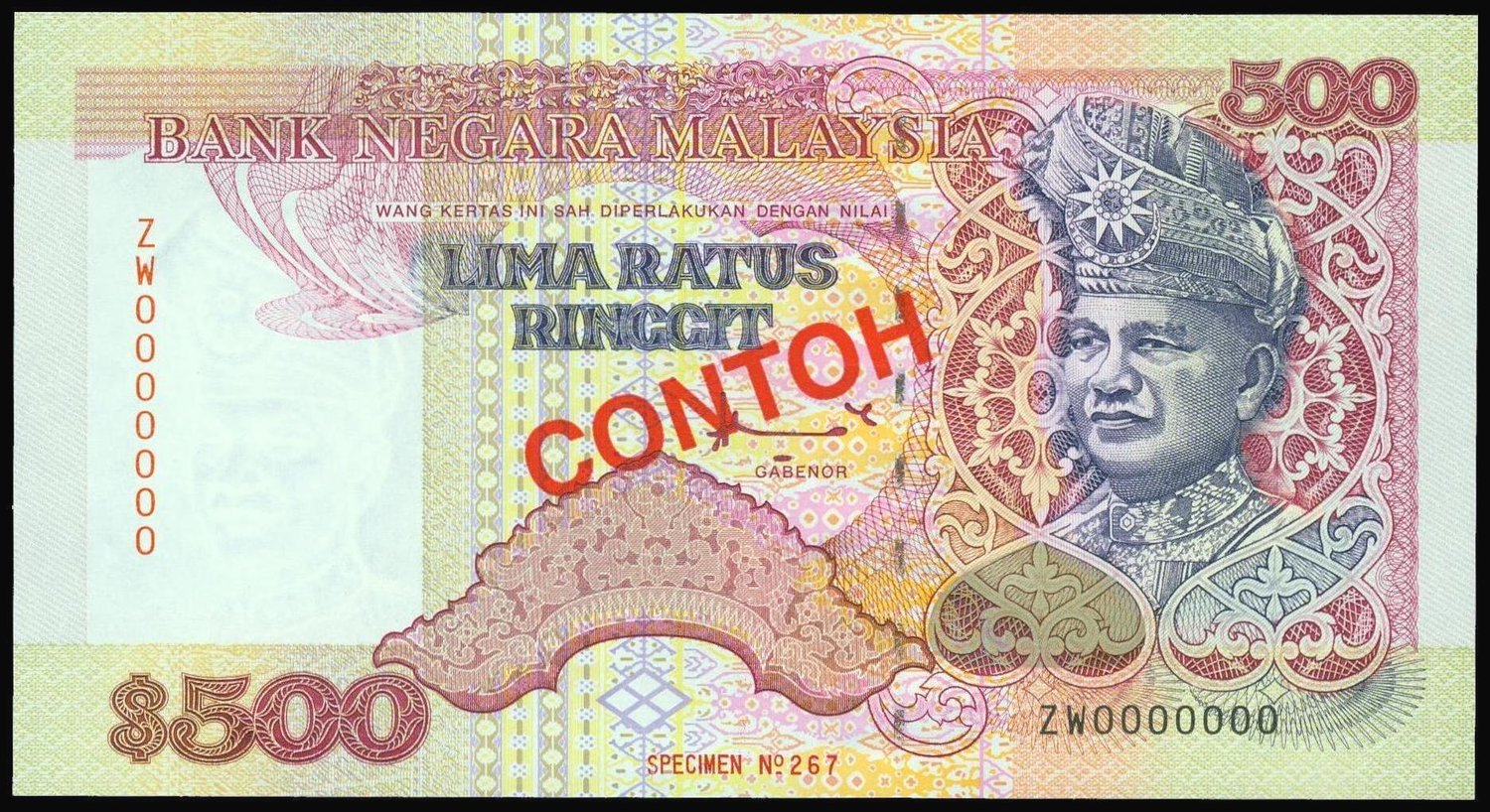 Malaysia, 500 ringgit, specimen, 2nd series type 3 (1995), serial number ZW0000000, red and brown on yellow and multicolour, T.A. Rahman at right, the reverse shows the High Court Building in Kuala Lumpur,