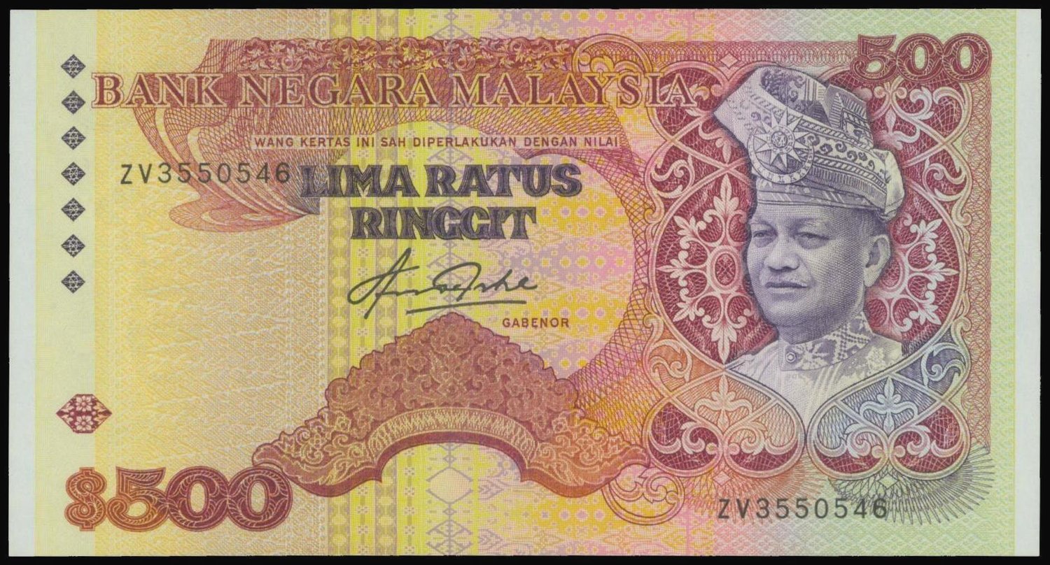 Malaysia, 500 ringgit, 2nd series, type I, serial number ZV3550546, dark red and purple and multicolour underprint, T.A. Rahman at right, High Court building on reverse,