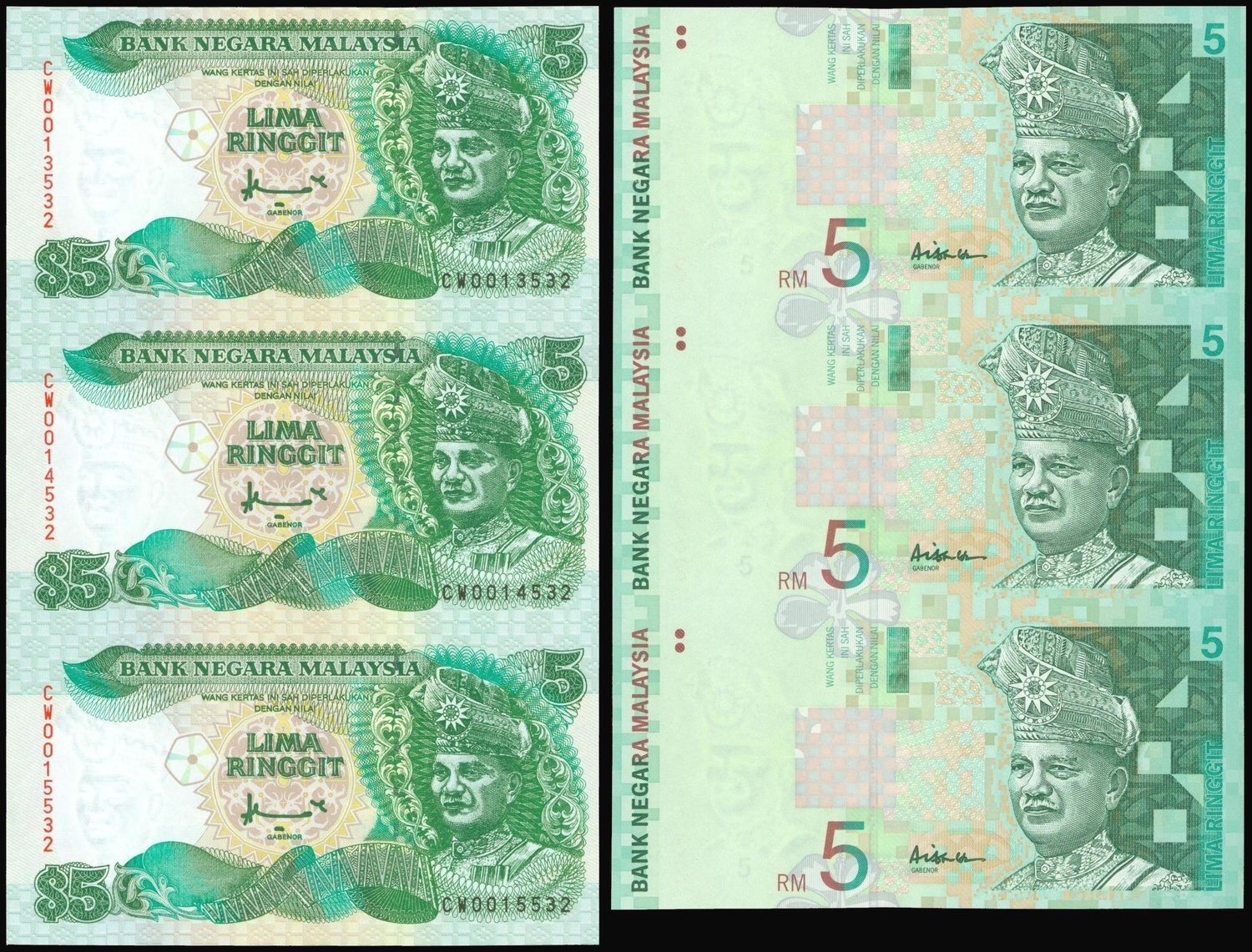 Malaysia,presentation booklet of RM5 uncut banknotes, 1984, 1999,two uncut blocks of 3 notes,