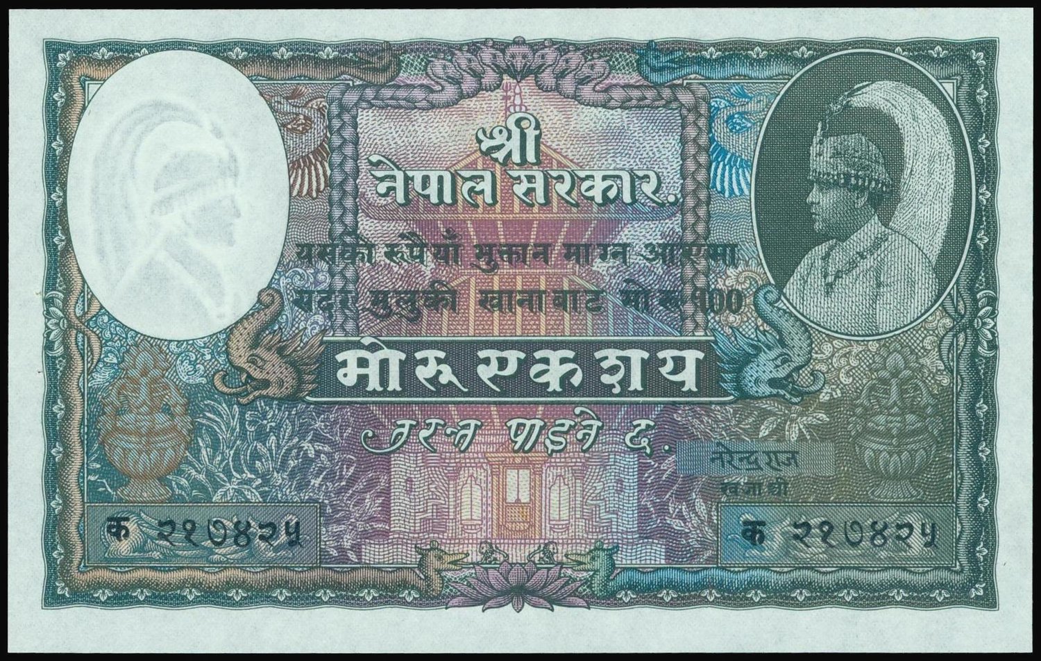 Nepal, 100 Mohru, no date (1951), dark green and multicolour, King Tribhuvana at right, rhinoceros on reverse,