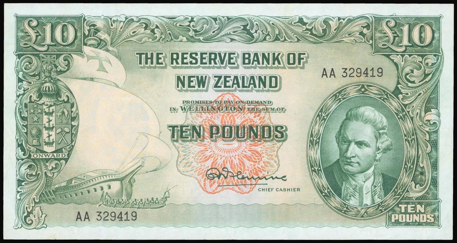 New Zealand, 10 pounds, no date (1961), serial number AA 329419, green and multicolour, Captain Cook at right, sailing ship at left, reverse green, grazing sheep on hillside,