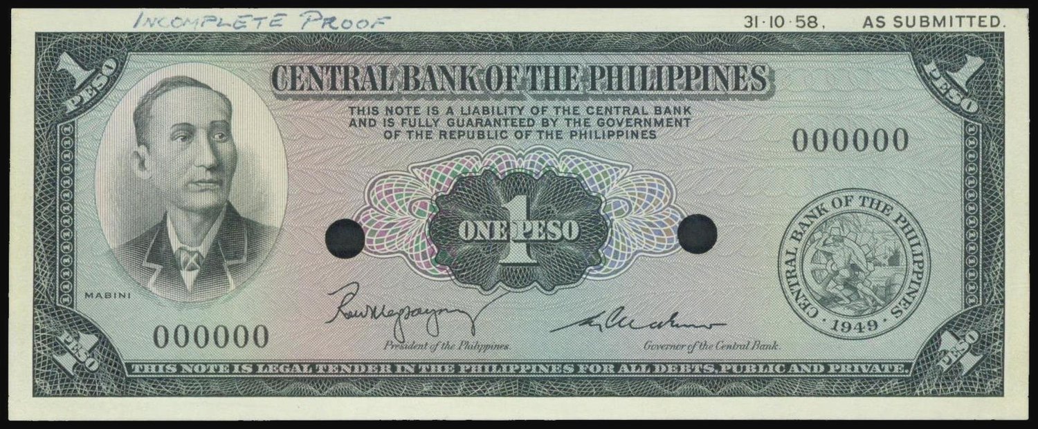 Philippines, 1 pesos, 'incomplete proof', 31.10.1958, black on blue and pink, A. Mabini at left, reverse bacl, Barasoian Church at centre,