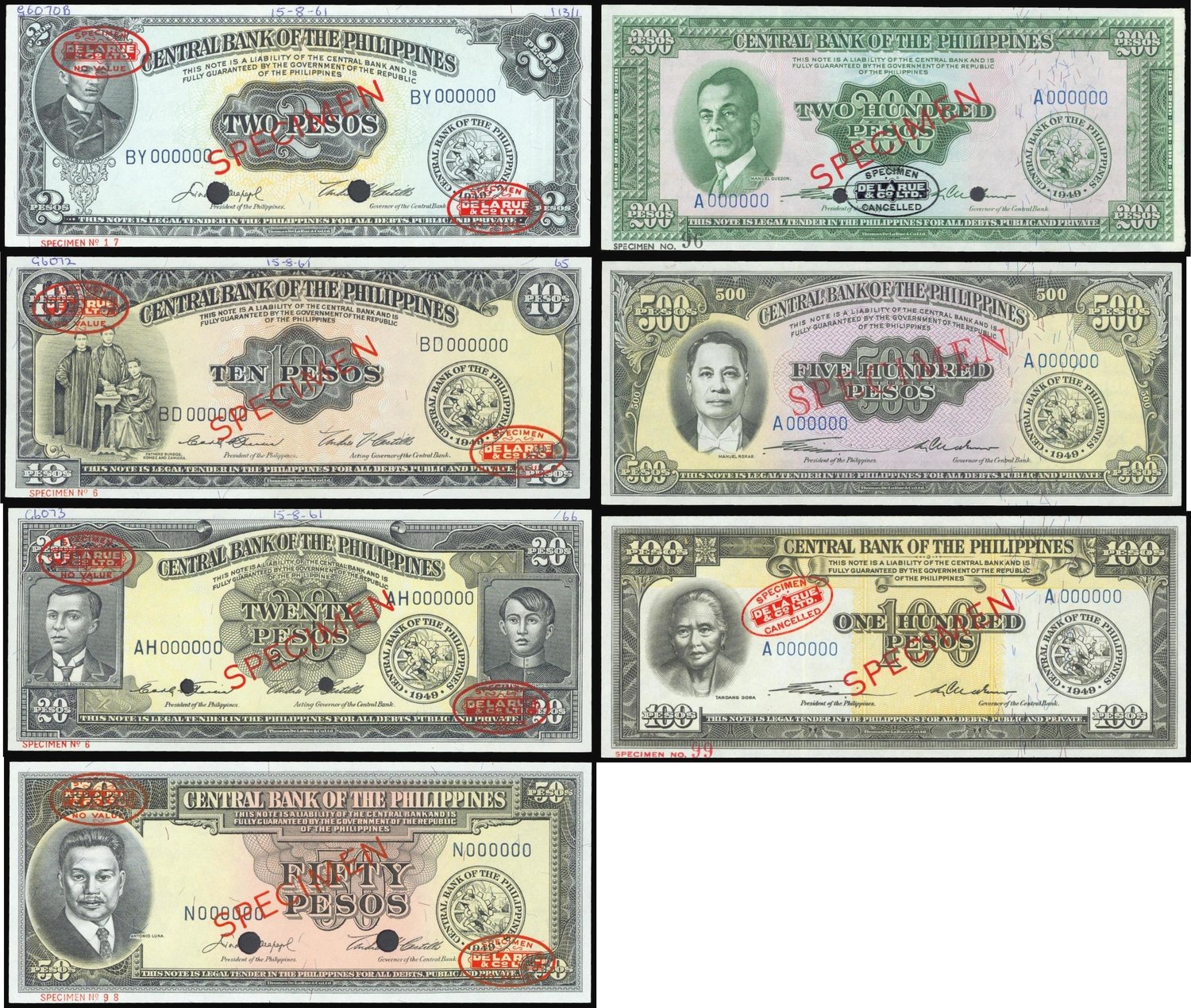 Philippines, partial set of specimens of the 1949 issue consisitng of, 2, 10, 20, 50, 100, 200 and 500 pesos,