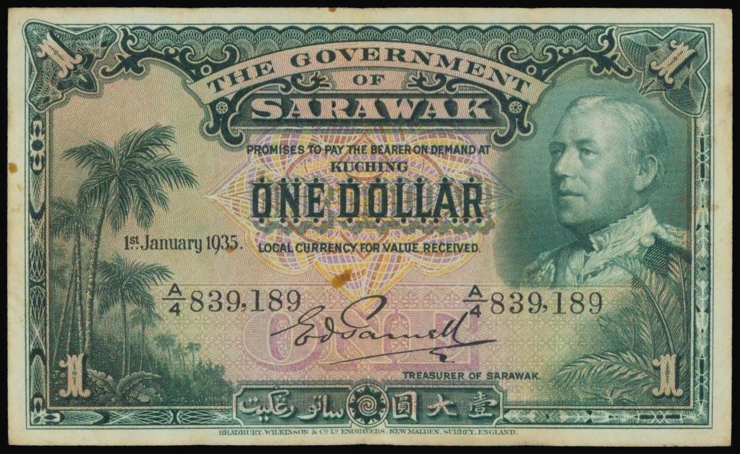 Sarawak, $1, 1935, serial number A/4 839189, green and multicolour, Brooke at top right, palm trees at left, reverse green, arms centrally,