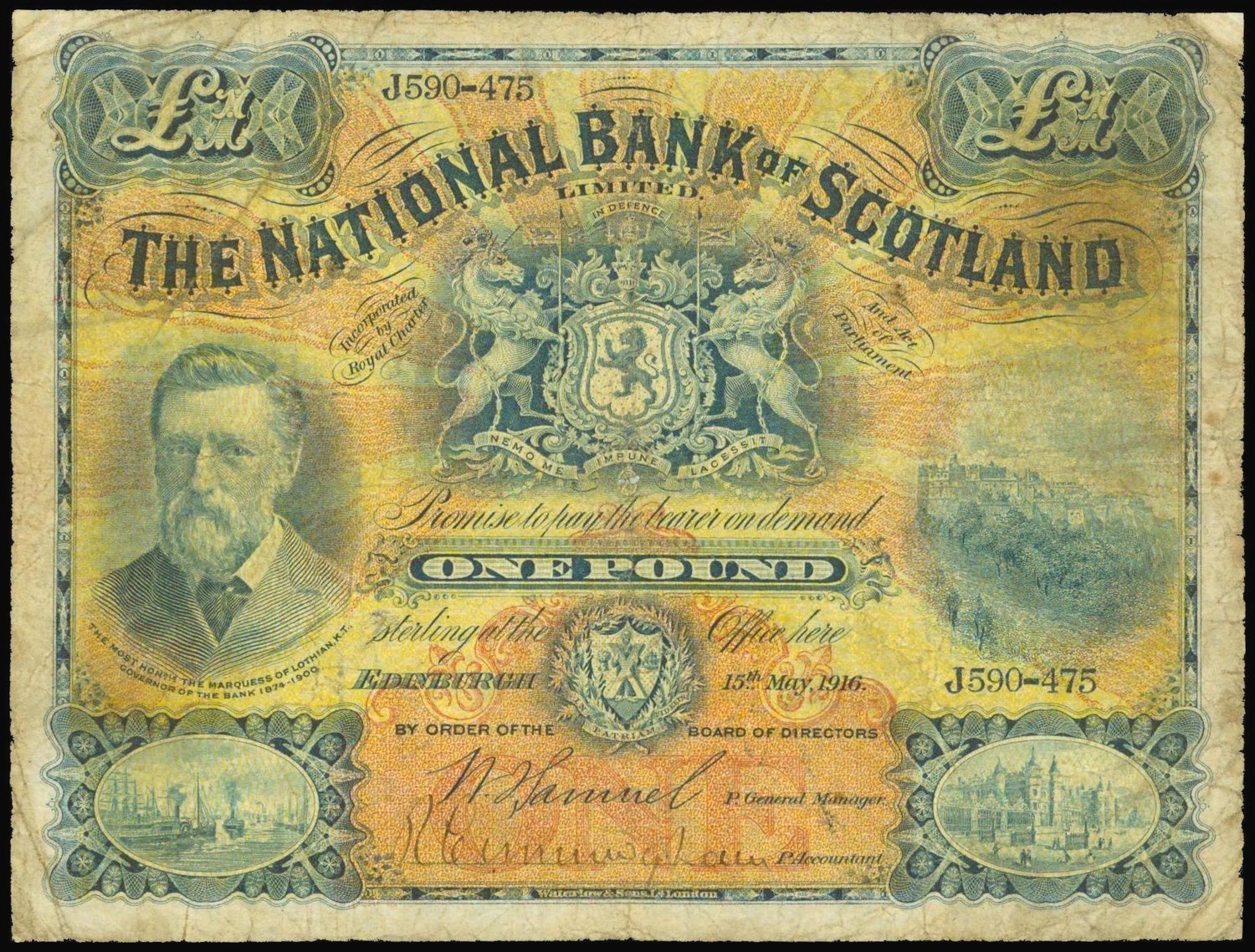 National Bank of Scotland, 1 pound, 1916, serial number J560475, blue, orange and yellow, Marquis of Lothian at left, arms upper centre, reverse blue,