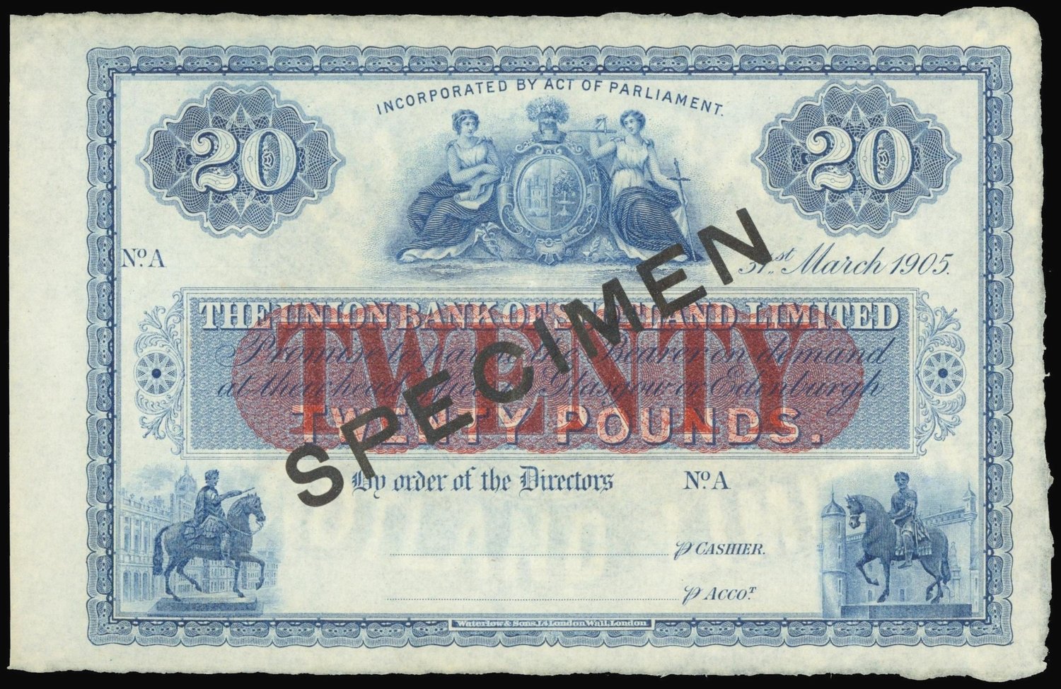 The Union Bank of Scotland Limited, 20 pounds, specimen, 1905, red and blue, bank crest top centre, '20' either side, equestrian statues bottom left and right, 'SPECIMEN' overprinted in black, reverse blue,