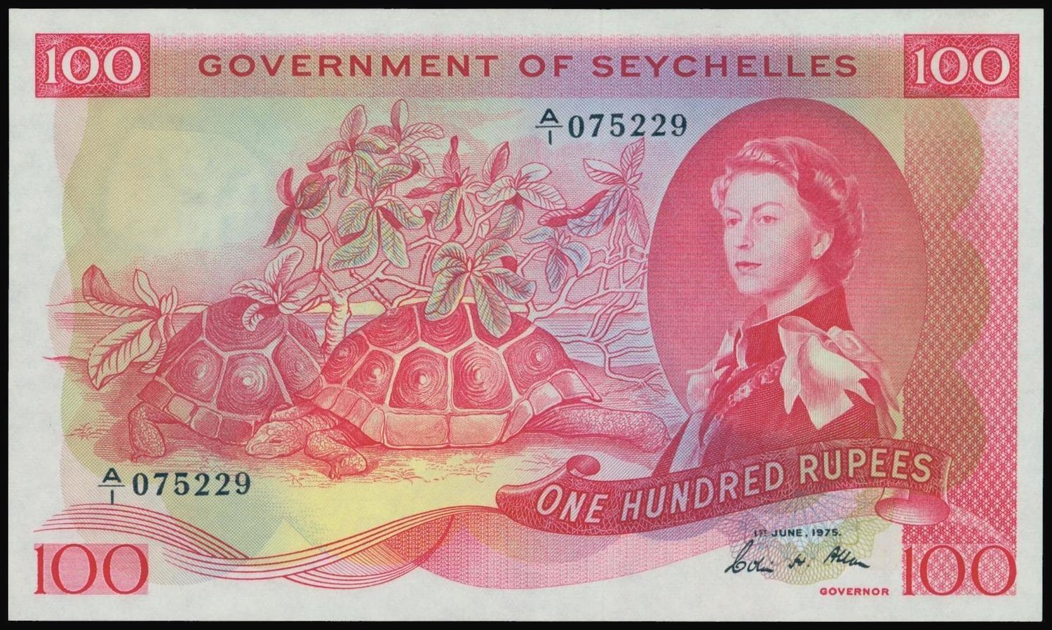 Government of Seychelles, 100 rupees, 1975, serial number A/1 075229, red, yellow and multicolour, Queen Elizabeth II at right, giant tortoises at left, '100' at each corner, reverse red and blue, geometric designs,