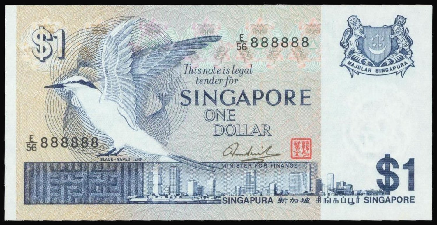 Singapore, $1, no date (1976), lucky serial number E/56 888888, blue and orange-brown, black naped tern at left of centre,
