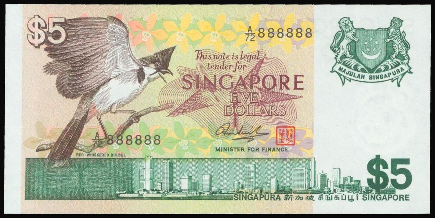Singapore, $5, no date (1976), lucky serial number A/72 888888, green and brown on multicolour, red whiskered bulbul at left,
