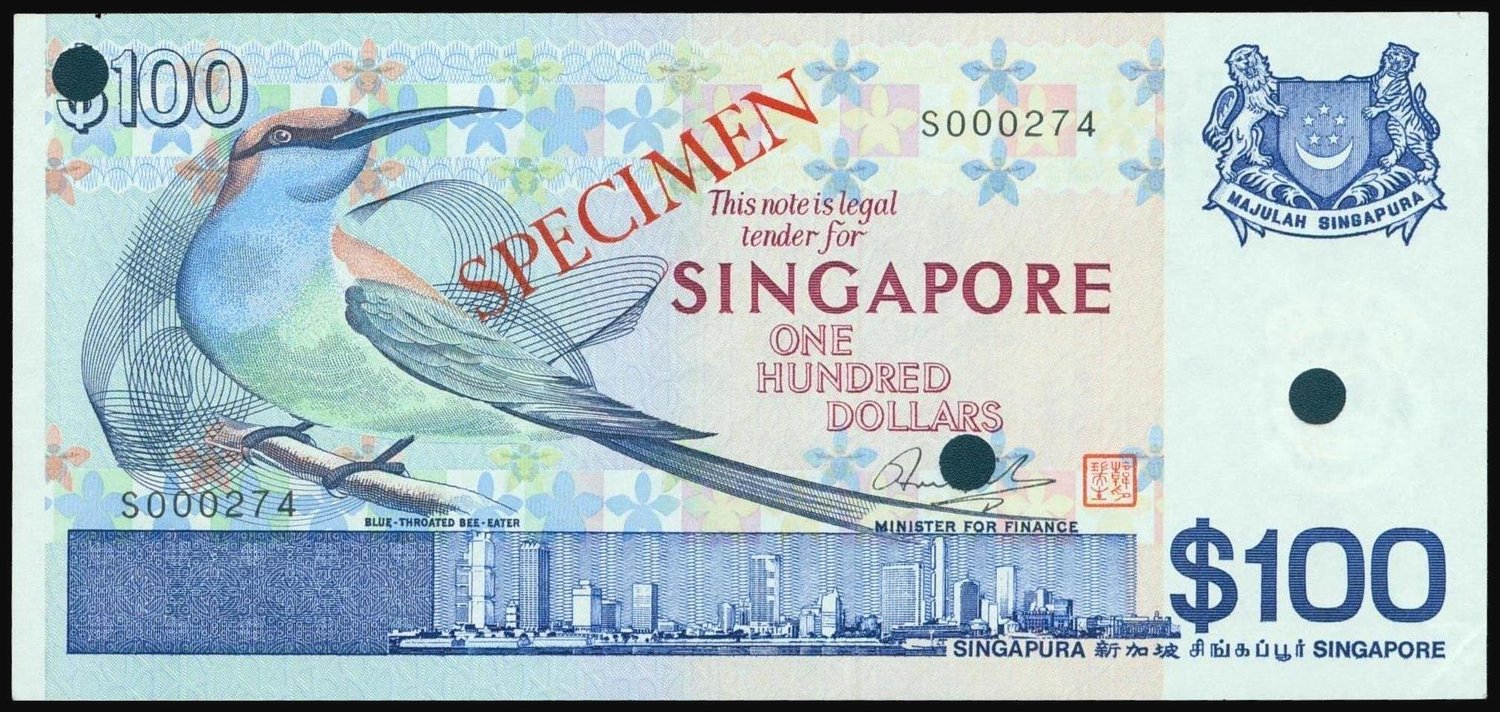 Singapore, $100, specimen, (1977), serial number S000274, the bird series, blue on multicolour, bee eater at left, watermark of a lion's head,