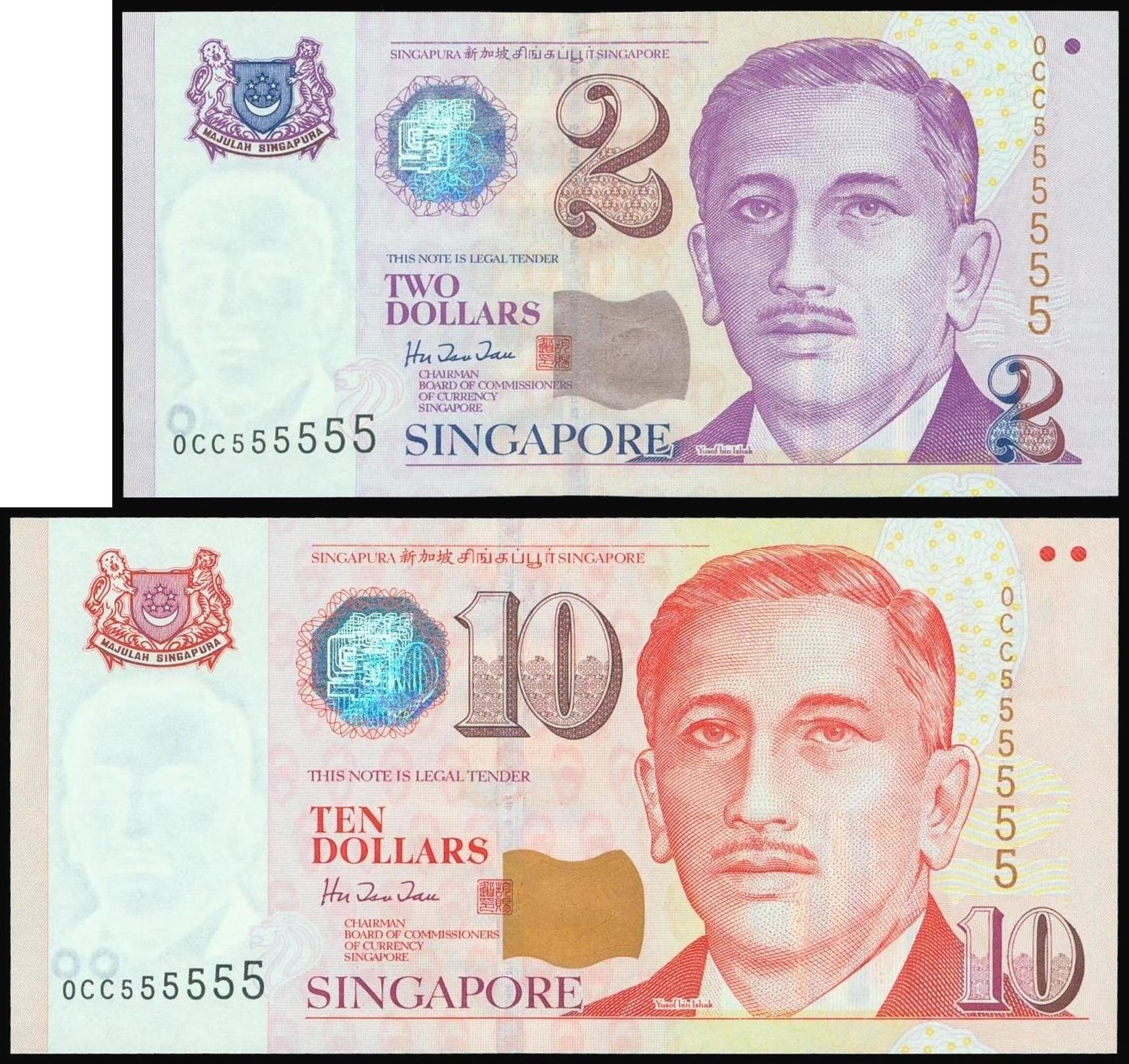 Singapore, lot of 2 banknotes, $2 and $10, both with the same lucky serial number OCC555555 purple and red respectively, Yusuf bin Ishak at right,