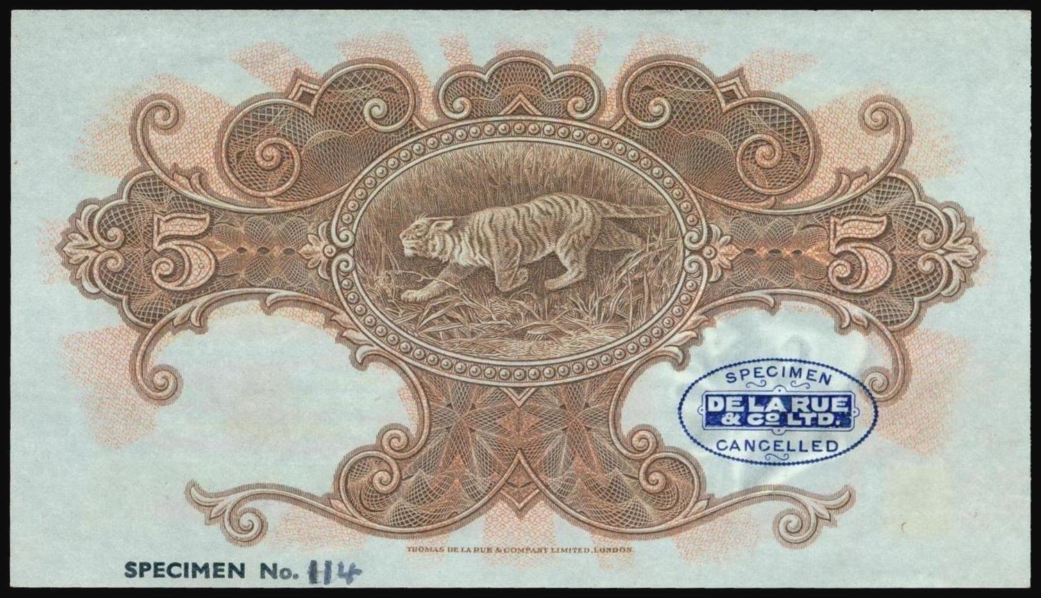 Straits Settlements, $5, uniface reverse proof, series of 1925-1930, brown, tiger in ornate cartouche at centre, blue De La Rue stamp,