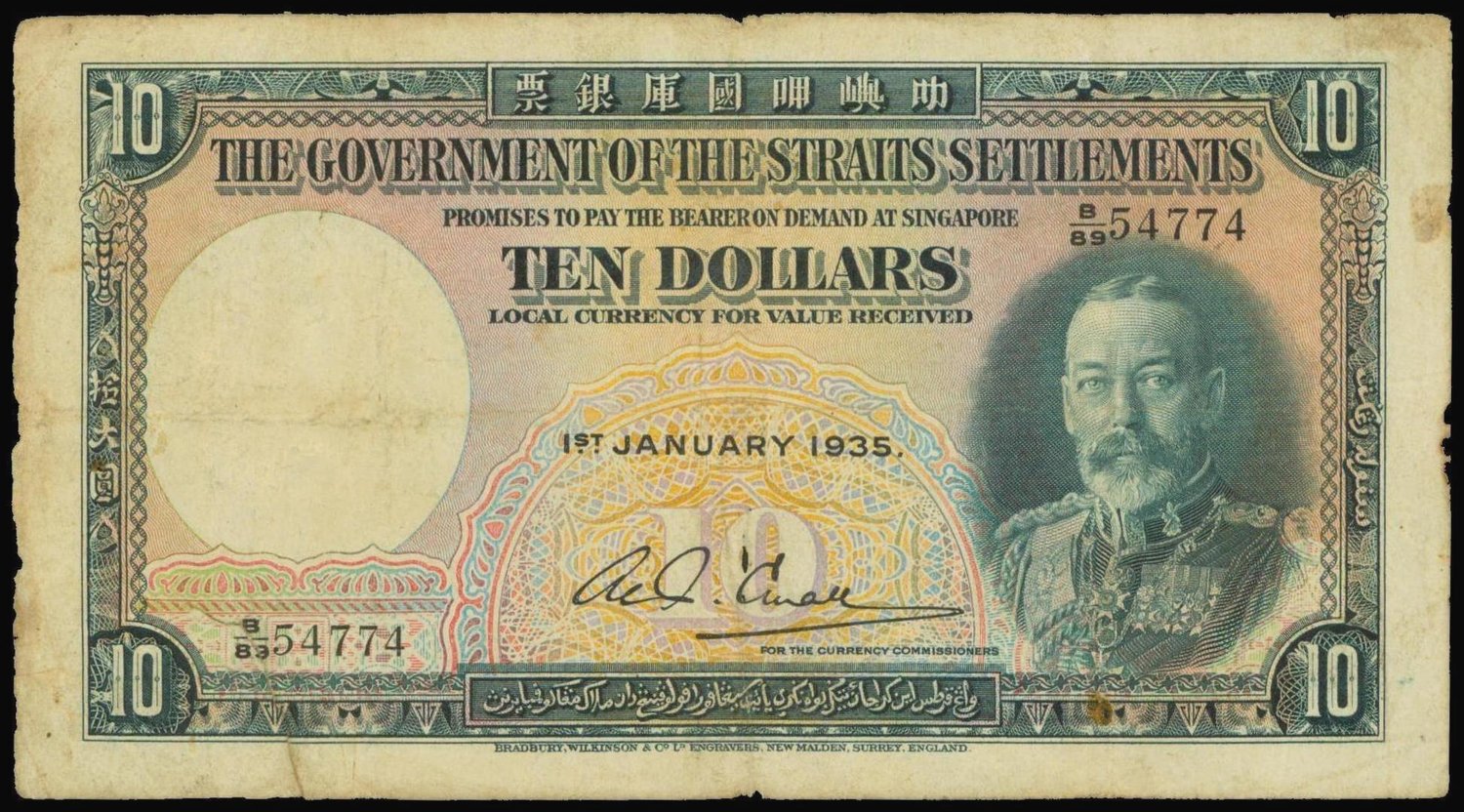 Government of the Straits Settlements,$10, 1 January 1935, serial number B/89 54774,green on multicolour underprint, George V at right, watermark of tiger head at left, reverse green, tiger at centre,