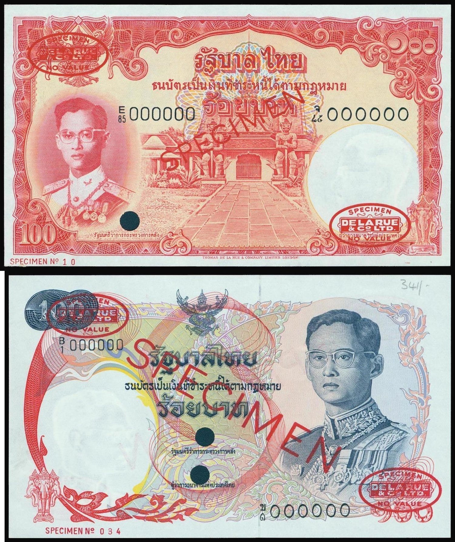 Government of Thailand, lot of 2 specimens, 100 baht, no date (1953 to 1956), and 100 baht, 1968, both red and multicolour and featuring King Bhumiphol,