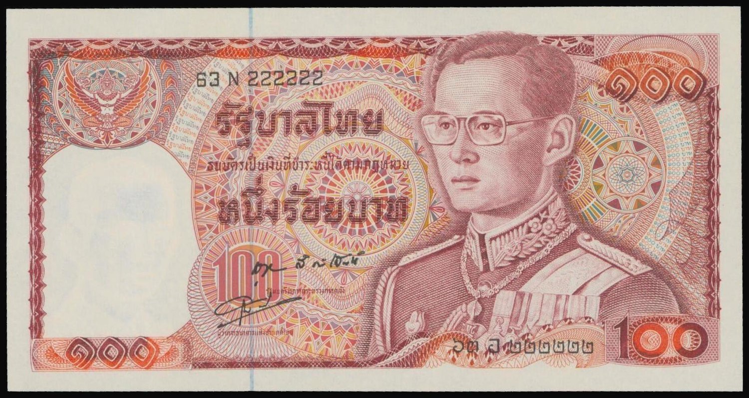 Bank of Thailand,100 Baht, ND(1978), solid serial number N222222, dark red and multicolour colour, Rama IX at right,reverse red and multicolour,