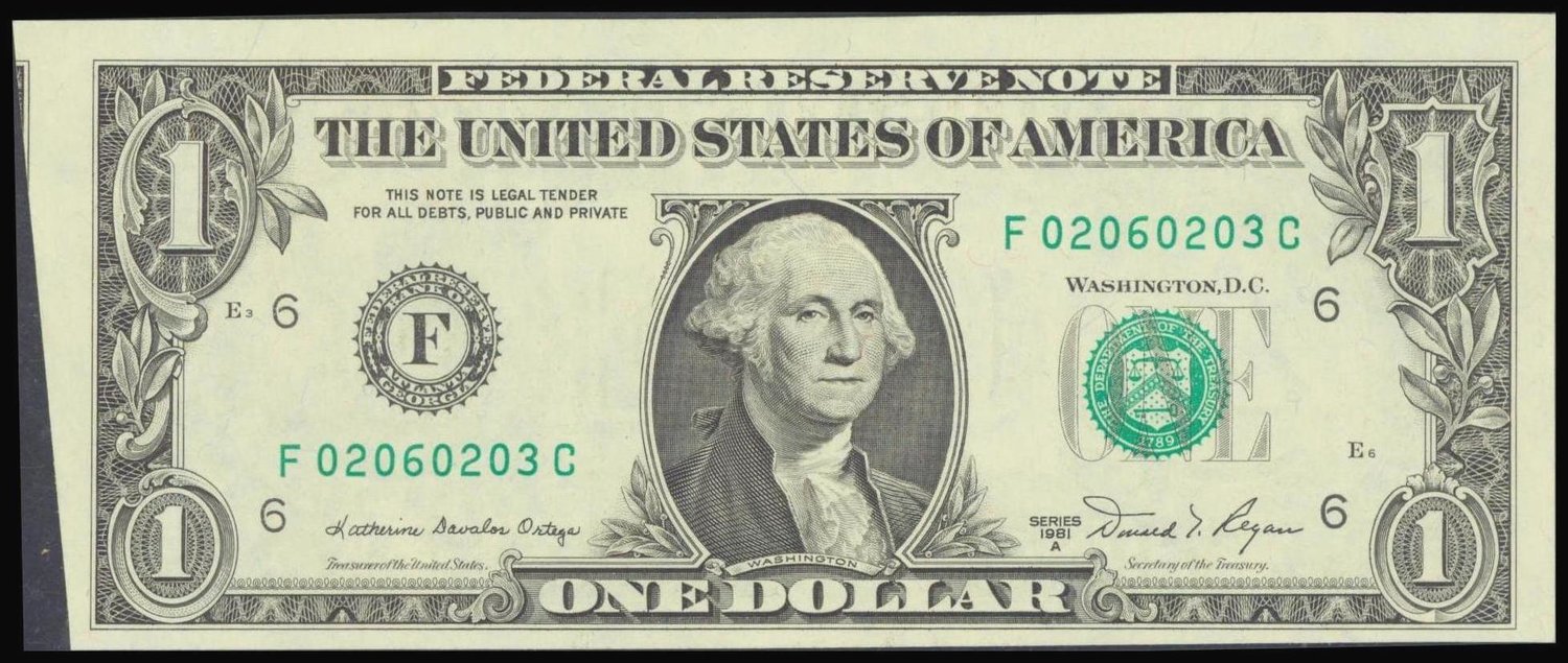 United States of America, $1, 1981A, error note, serial number F02060203C, Goerge Washington on obverse, cutting error top left,
