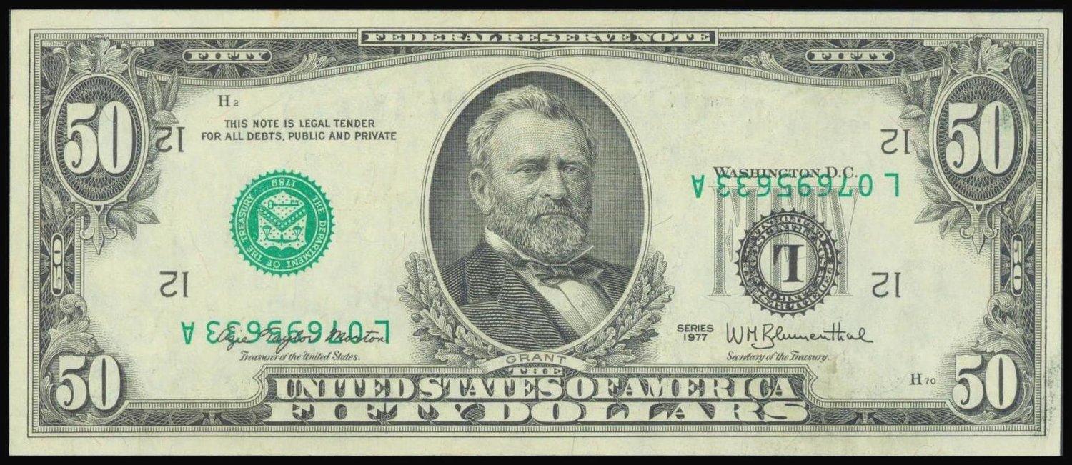 United States of America, $50, 1977, error note, serial number L07695633A, inverted overprint of the black seal and serial numbers,