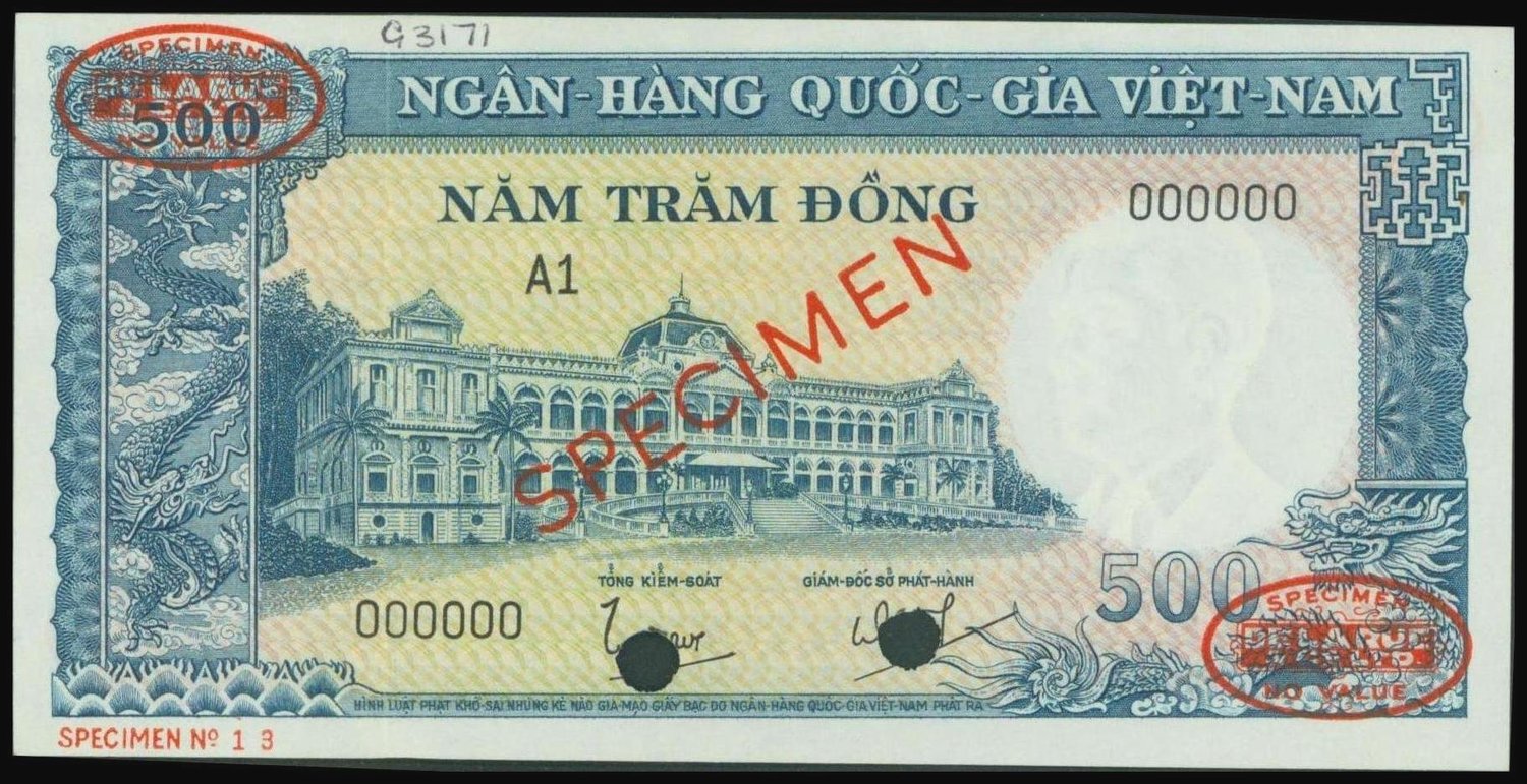 South Vietnam, 500 dong, specimen, no date (1962), green-blue on gold and pink, dragon at left, presidential-like building at centre,
