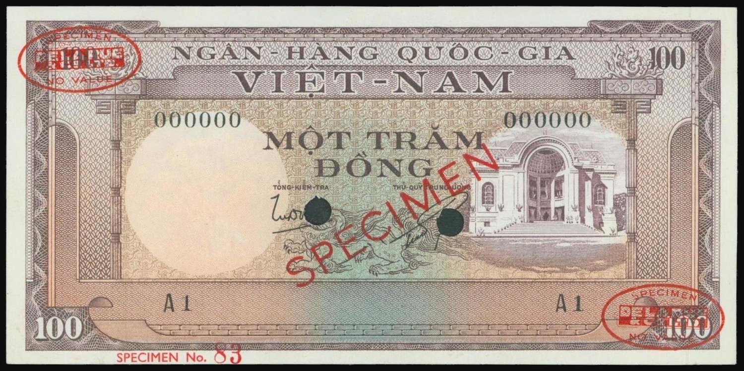 South Vietnam, 100 dong, specimen, 1966, brown and green, building with domed roof at right,
