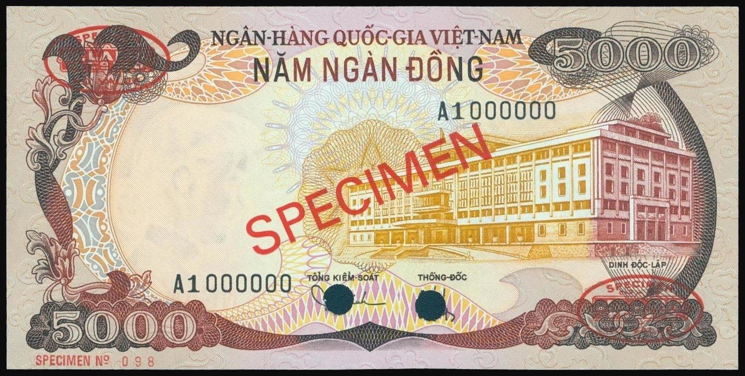South Vietnam, 5000 dong, specimen, 1975, brown and multicolour, Palace of Independence at right, leopard on reverse,