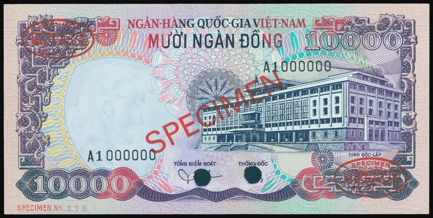 South Vietnam, 10,000 dong, specimen, 1975, violet and multicolour, Palace of Independence at right, water buffalo on reverse,