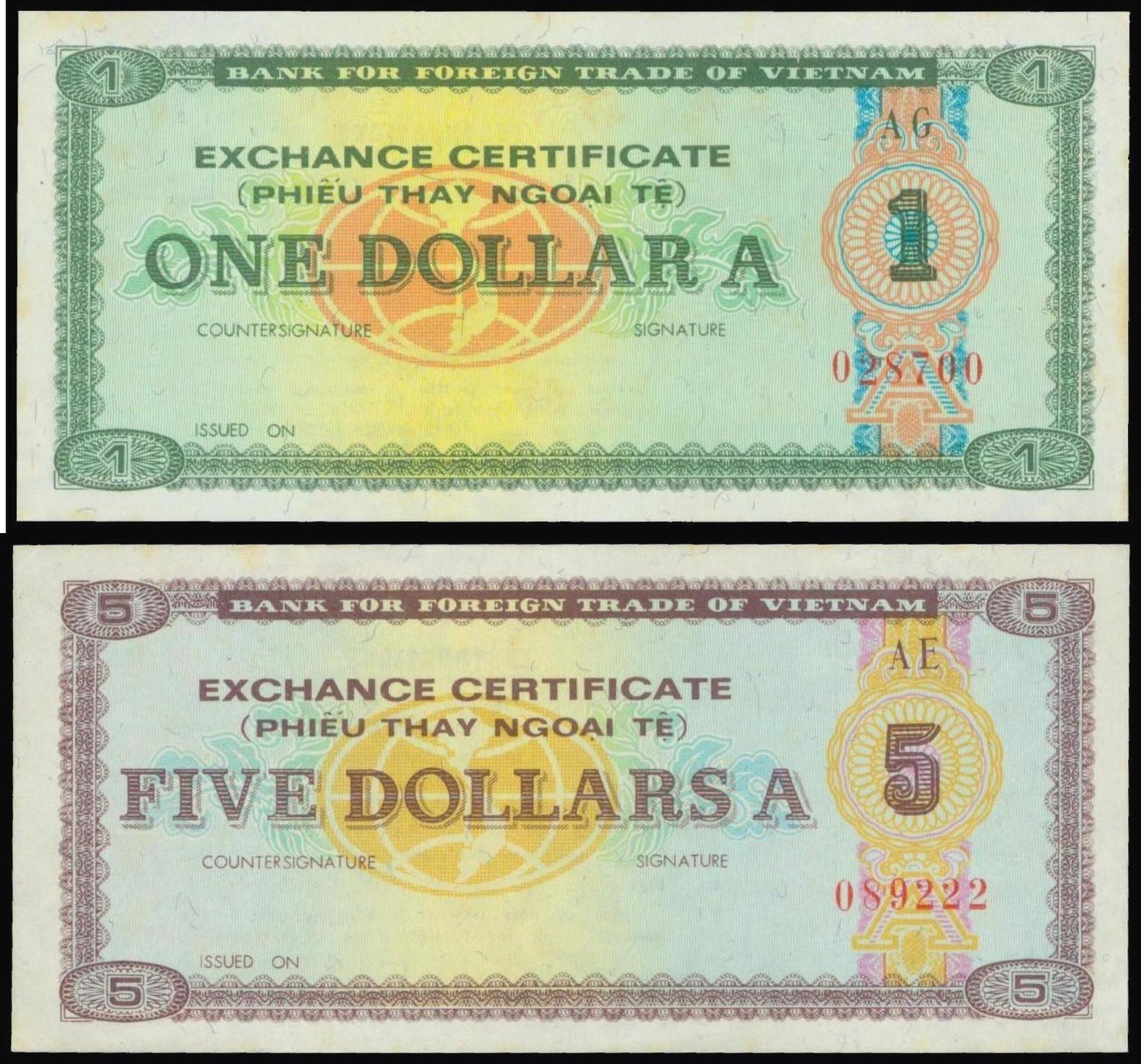 Bank for Foreign Trade of Viet Nam,1981 US Dollar A Issue, $1 and $5, ND(1981-84), serial number 028700 and 089222, unissued,$1 green on peach and light blue underprint, $5 purple on peach and light blue underprint,