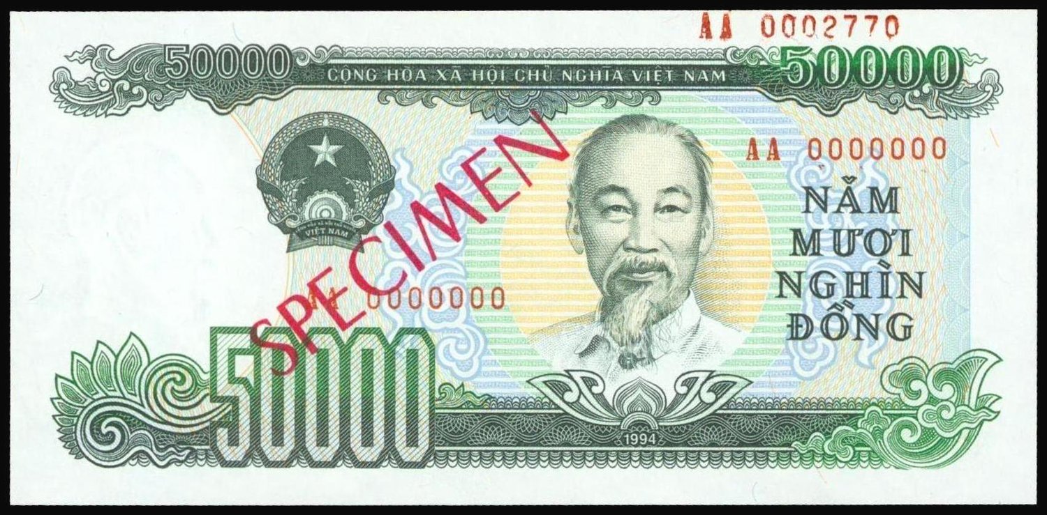 Vietnam, 50,000 dong, specimen, 1994, serial number AA 0000000, dark green and black, Ho Chi Minh at right, reverse green, dockside,