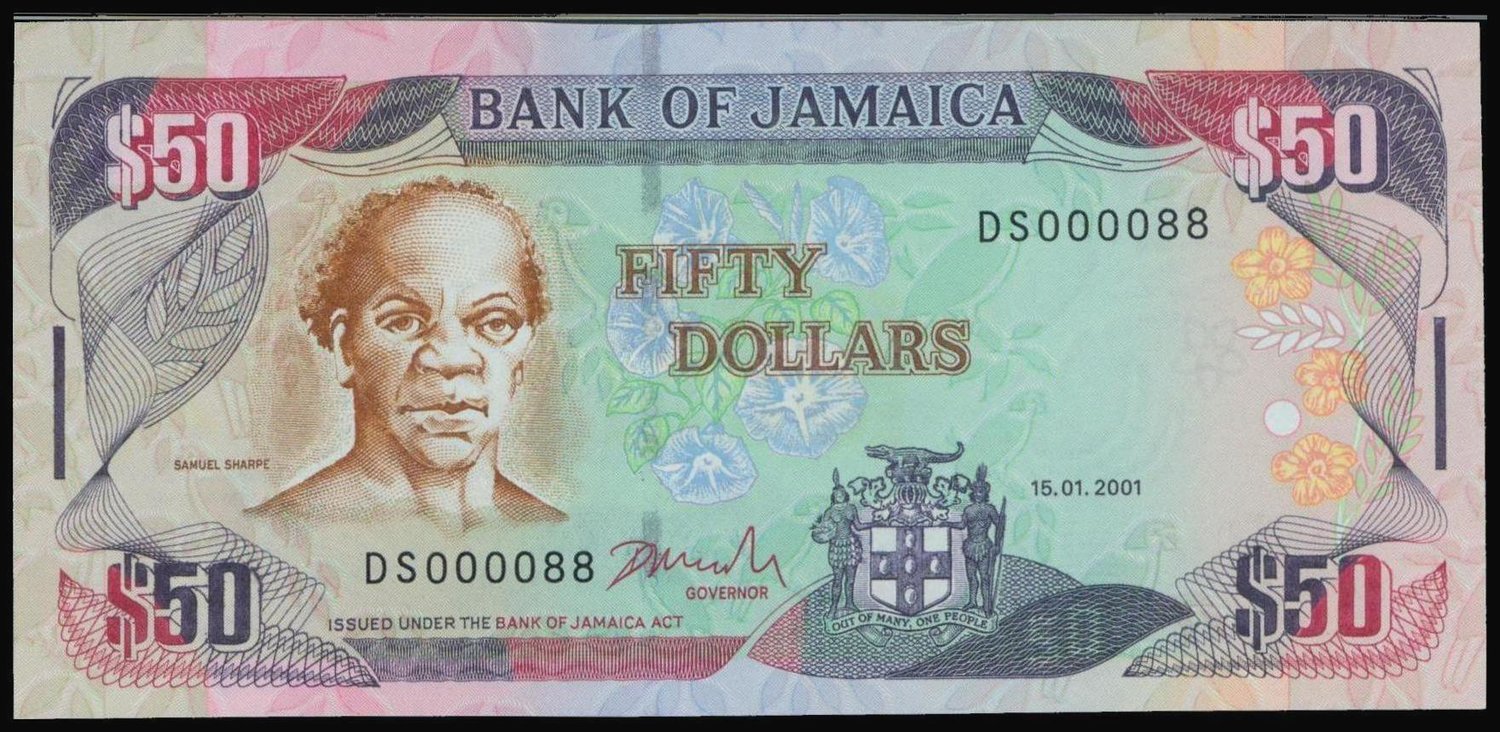 Bank of Jamaica,50 pounds, 2001, serial number DS 000088,‘semi-lucky number’
