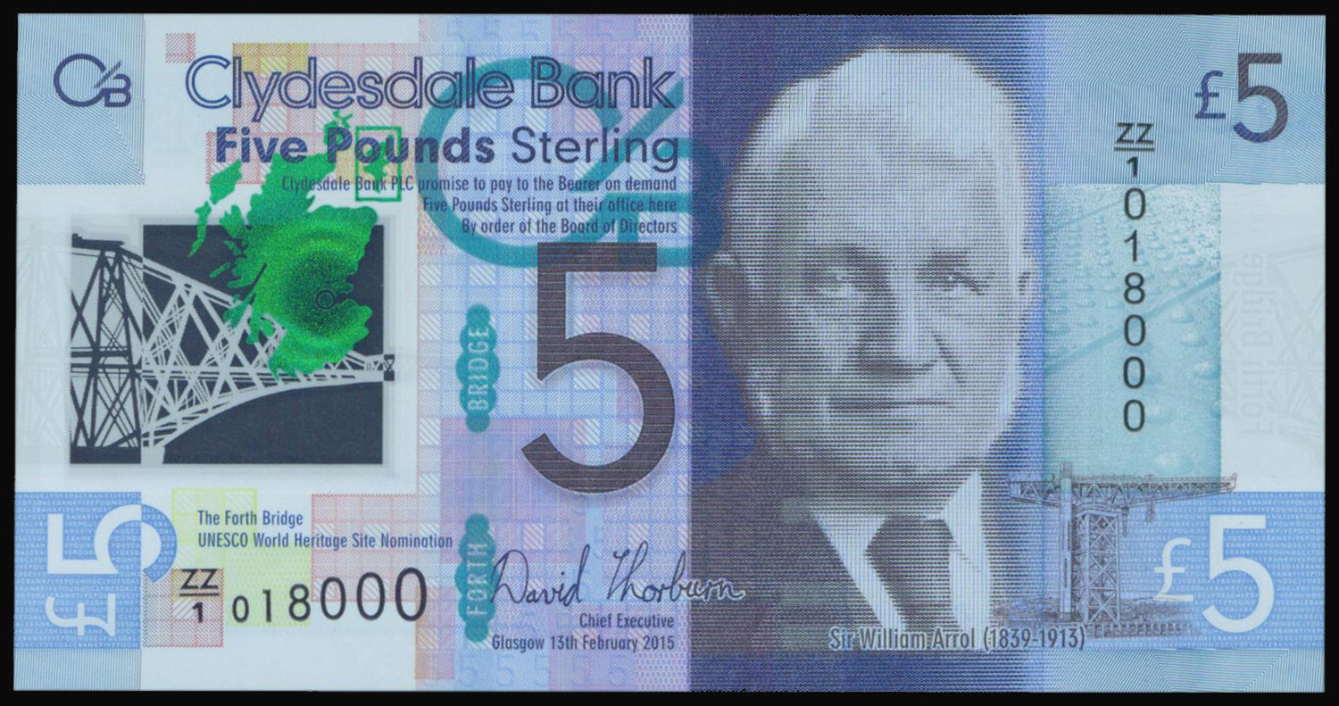 Scotland, Clydesdale Bank,5 Pounds, 2015, serial number ZZ1 018000,‘Commemorative’, ‘Replacement/Star’