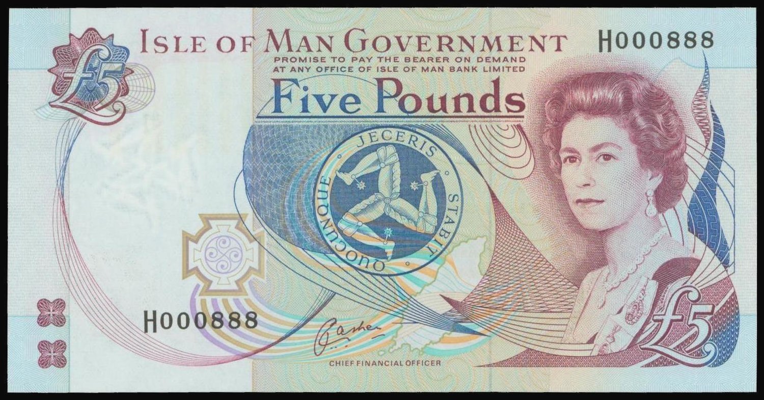Isle of Man Government, 5 Pounds, N.D. 1983, serial number H 000888, ‘semi-lucky number’,