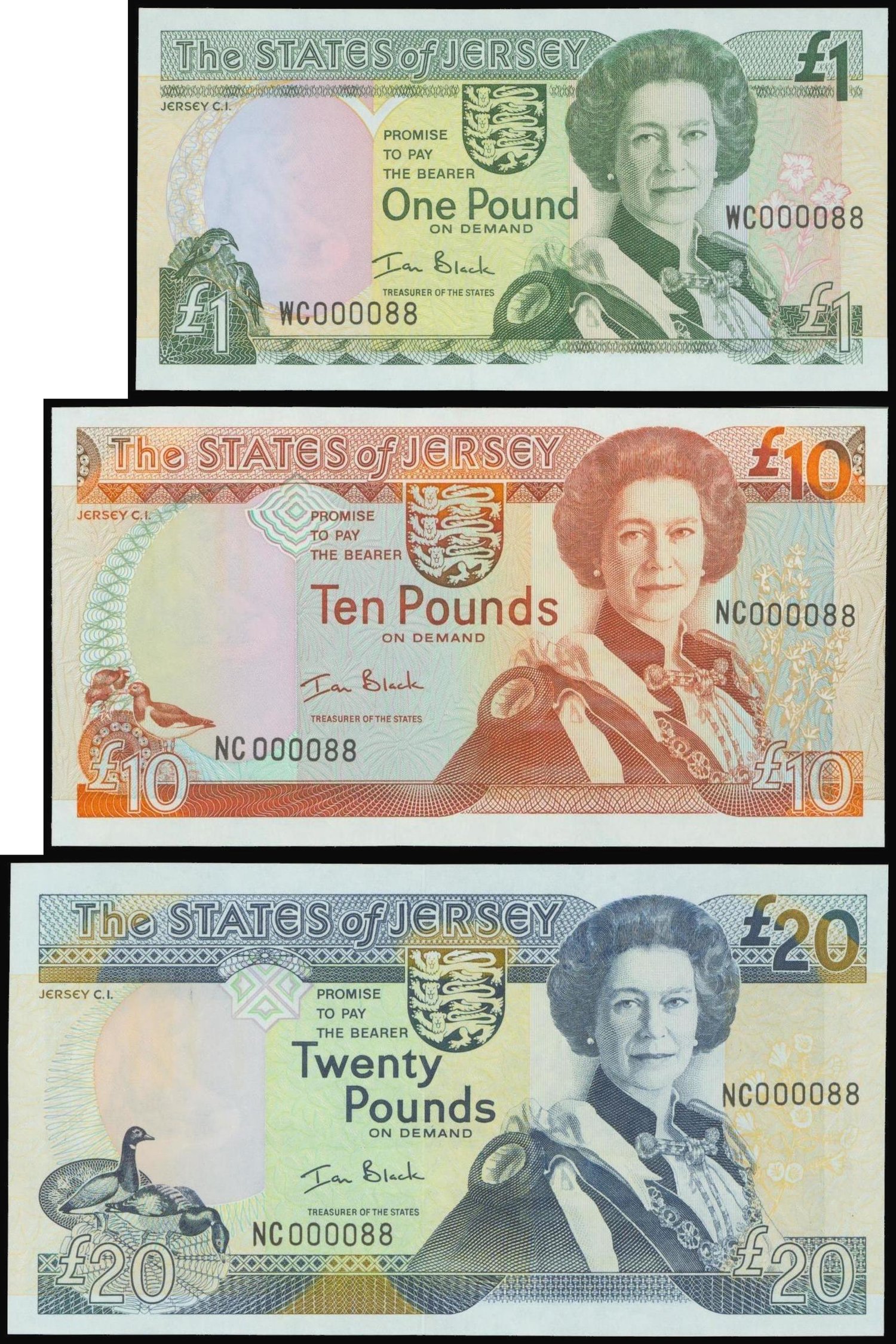 States of Jersey, 1, 10, 20 Pounds, N.D. 2000, prefix NC/NC/WC, identical serial number 000088, ‘semi-lucky number’,