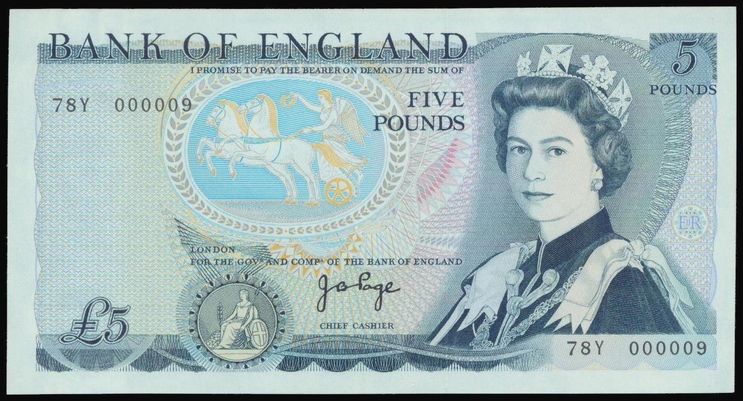 Bank of England, 5 Pounds, N.D. 1973-1980, serial number 78Y 000009, ‘low number’,