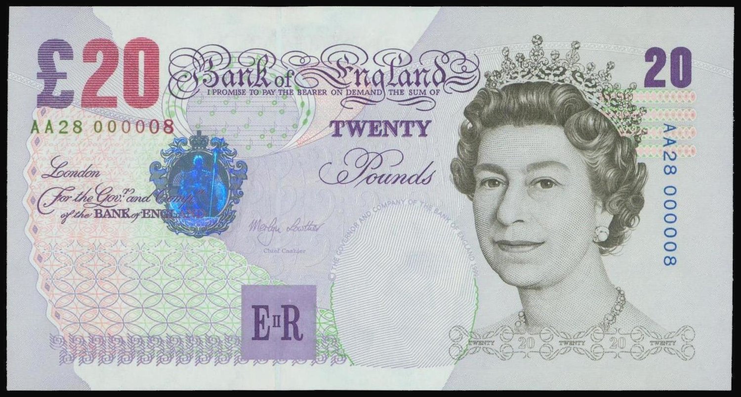 Bank of England, 20 Pounds, N.D. 1999-2003, serial number AA28 000008, ‘semi-lucky number’,