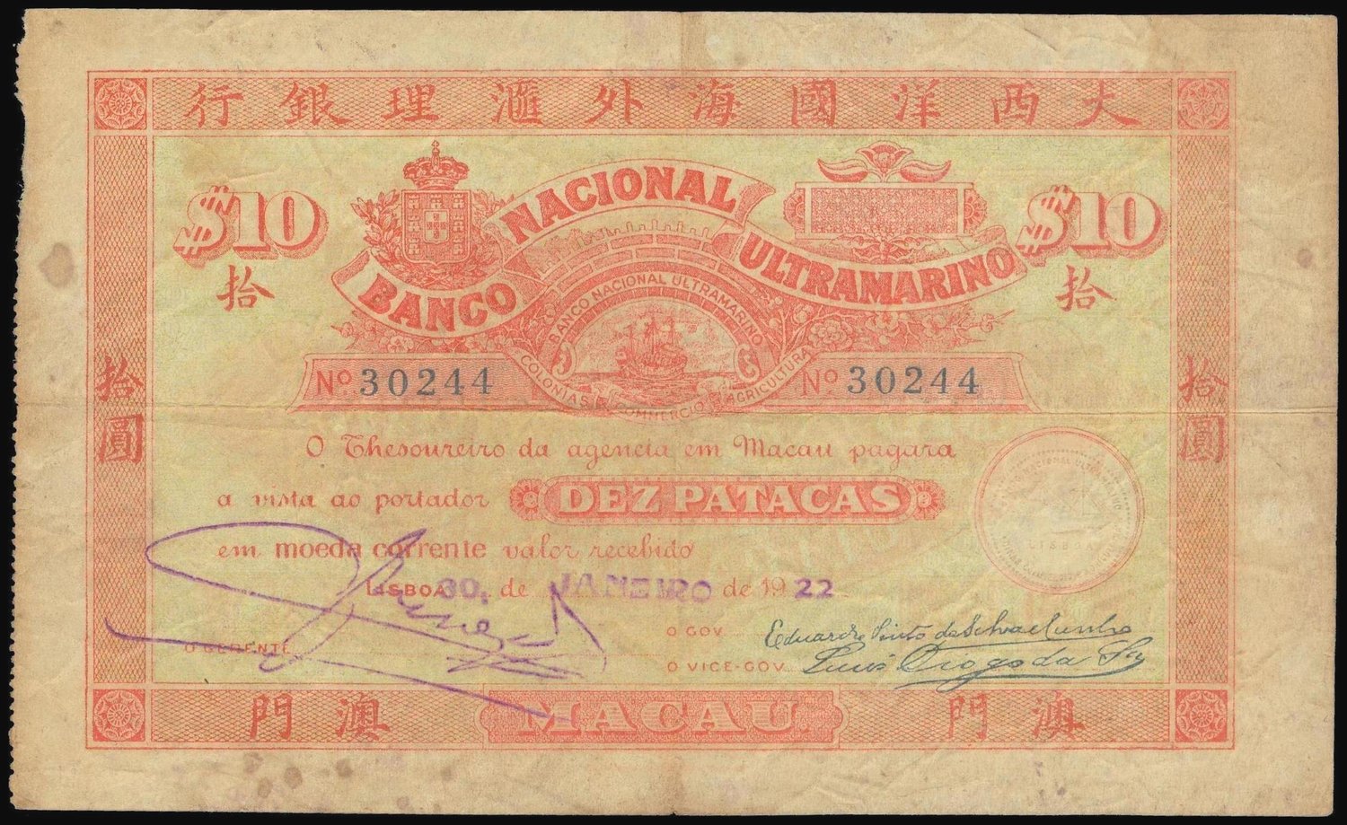 Banco Nacional Ultramarino, 10 patacas, 1922, contemporary forgery, serial number 30244, red on light green underprint, crowned arms at upper left, ship seal top centre,