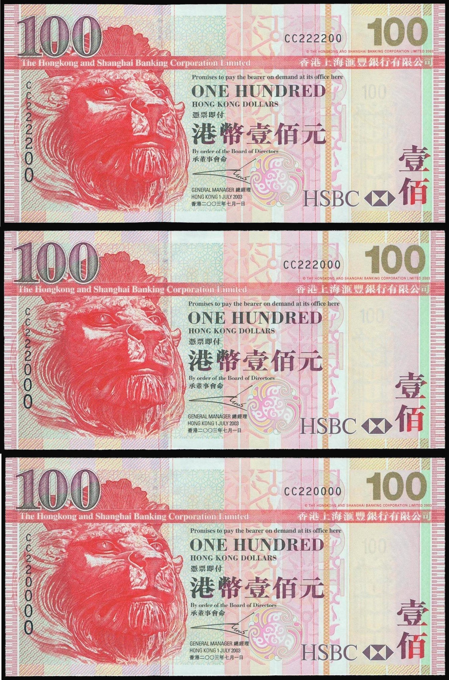 The HongKong and Shanghai Banking Corporation, lot of 3x $100, 2003, CC prefix 220000, 222000 and 222200, (Pick 209a), uncirculated (3)