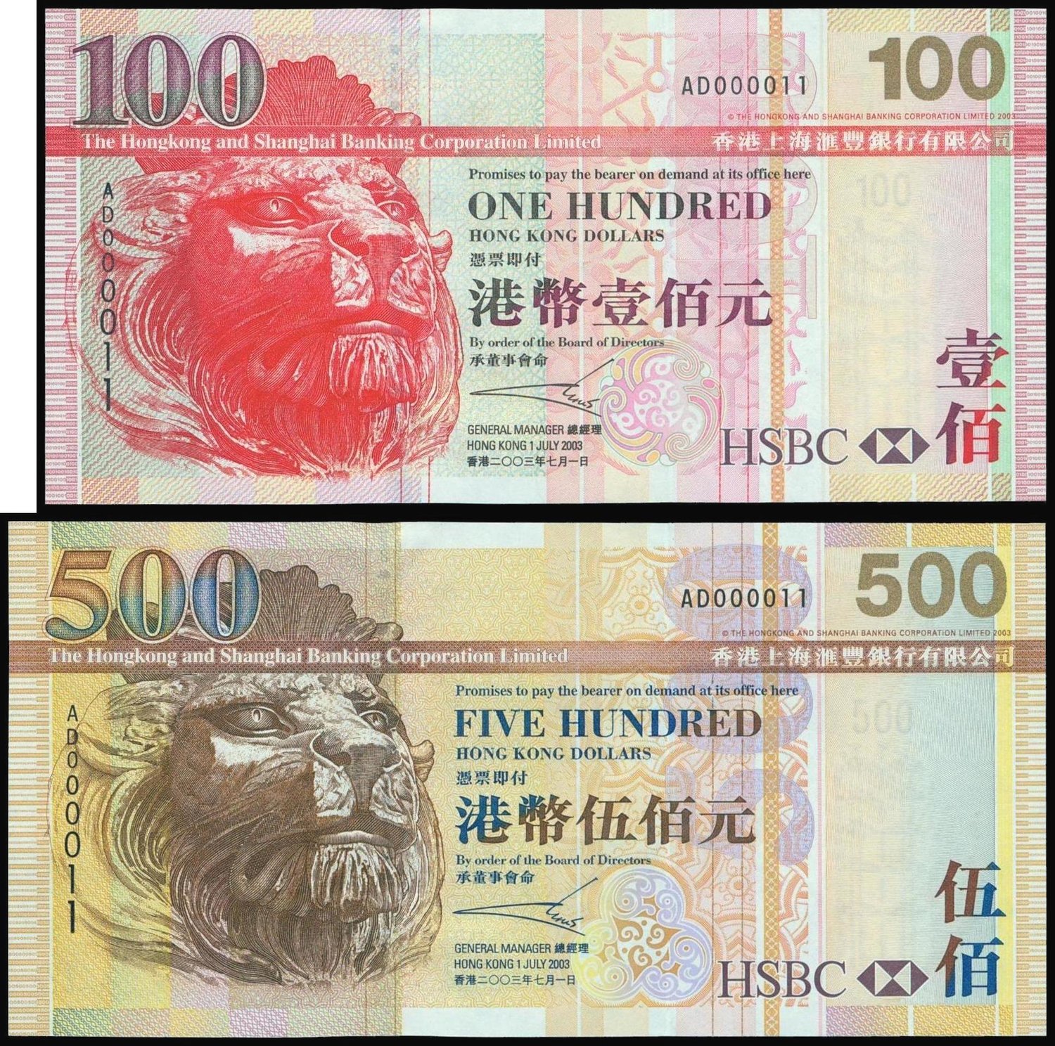 The HongKong and Shanghai Banking Corporation, pair of $100 and $500, identical low serial number AD000011, (Pick 209 and 210), uncirculated (2)