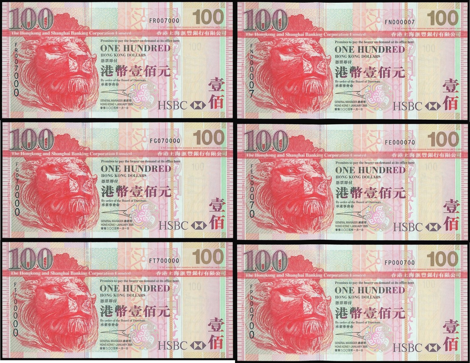 The HongKong and Shanghai Banking Corporation, $100, 2005, low serial number 700000, 070000, 007000, 000700, 000070 and 000007, (Pick 209), uncirculated (6)