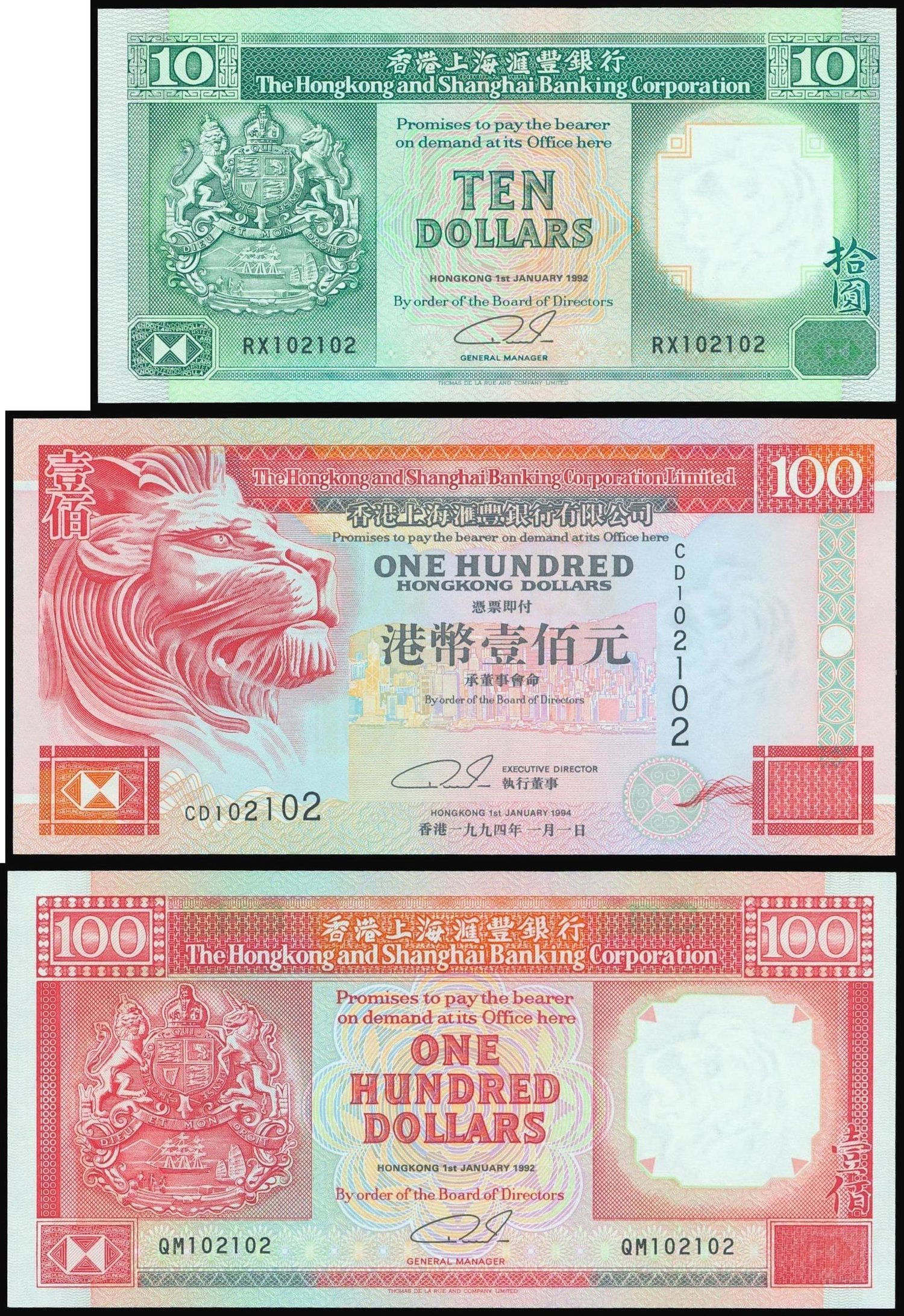 The HongKong and Shanghai Banking Corporation, lot of 3 notes, $10 and $100 (2), 1992 to 1994, all with the same serial number 102102, (Pick 191c, 198 and 203a), uncirculated (3)