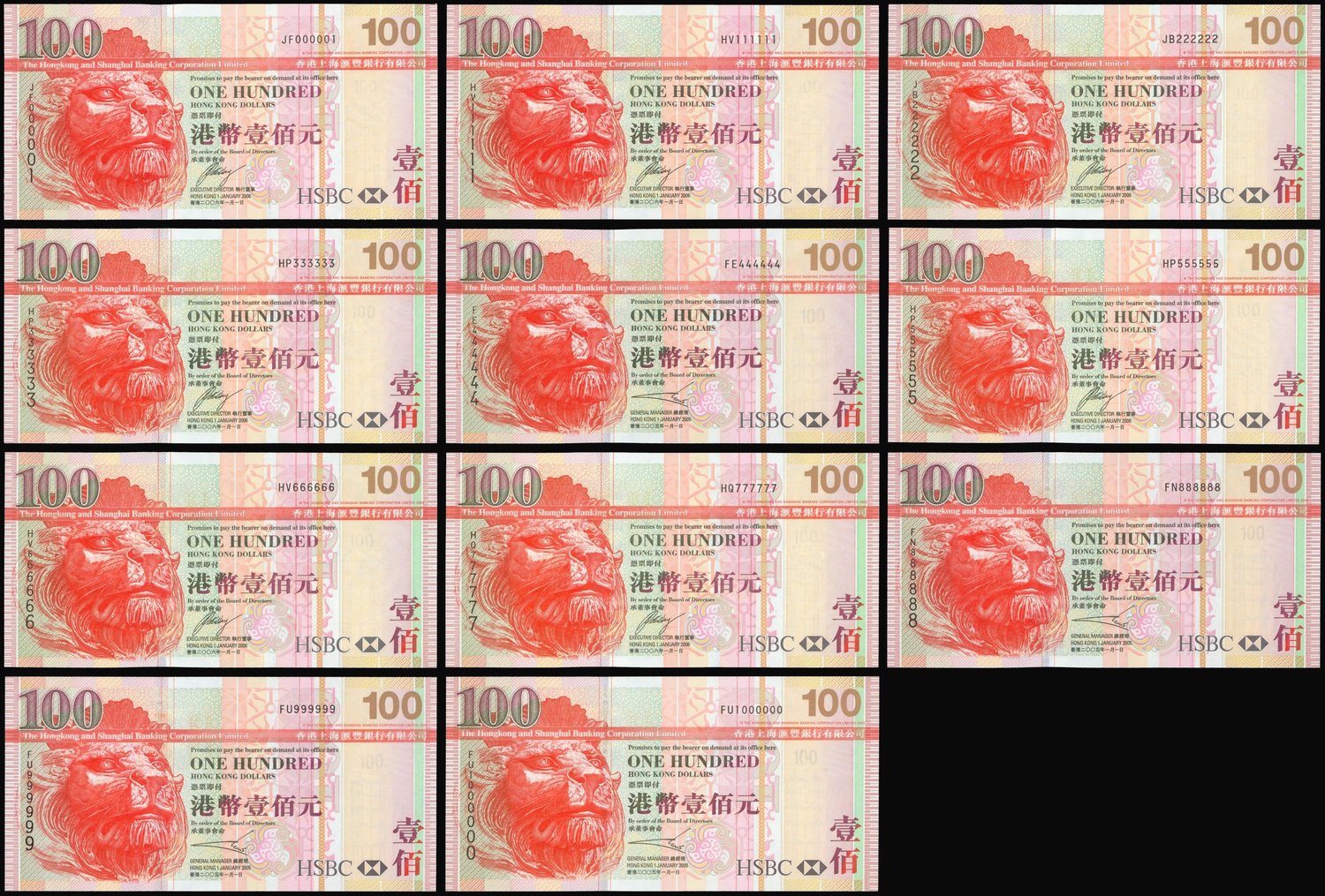 The HongKong and Shanghai Banking Corporation, $100, 2005-2006, a mix prefix lucky number set of 11, 000001, solid numbers 111111 to 999999 and 1000000, red and multciolour, lion at left, watermark of the HSBC building at right,