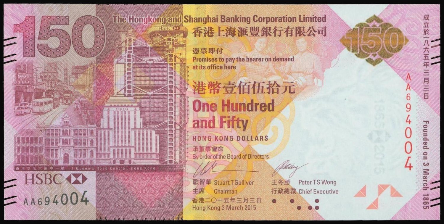 Hong Kong and Shanghai Banking Corporation,$150, 3 March 2015, ‘HSBC 150th Anniversary Commemorative’ note, serial number AA694004,purple on multicolour underprint, old and new bank buildings at left, reverse purple, children sit by the lion at right,