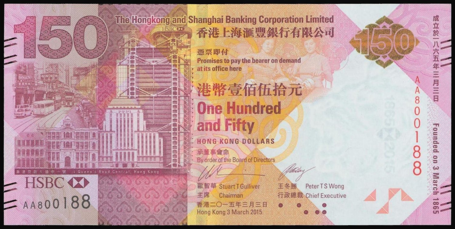 Hong Kong and Shanghai Banking Corporation,$150, 3 March 2015, ‘HSBC 150th Anniversary Commemorative’ note, lucky number AA800188,purple on multicolour underprint, old and new bank buildings at left, reverse purple, children sit by the lion at right,