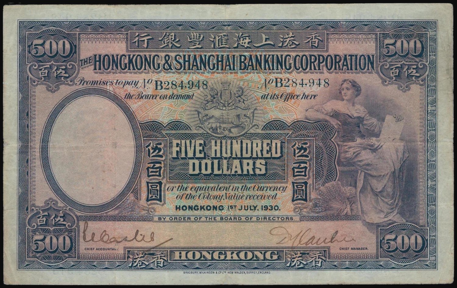 The HongKong and Shanghai Banking Corporation, $500, 1930, serial number B284948, dark brown on purple and multicolour underprint, seated woman at right holding a stone tabley, the reverse shows the old HSBC building,