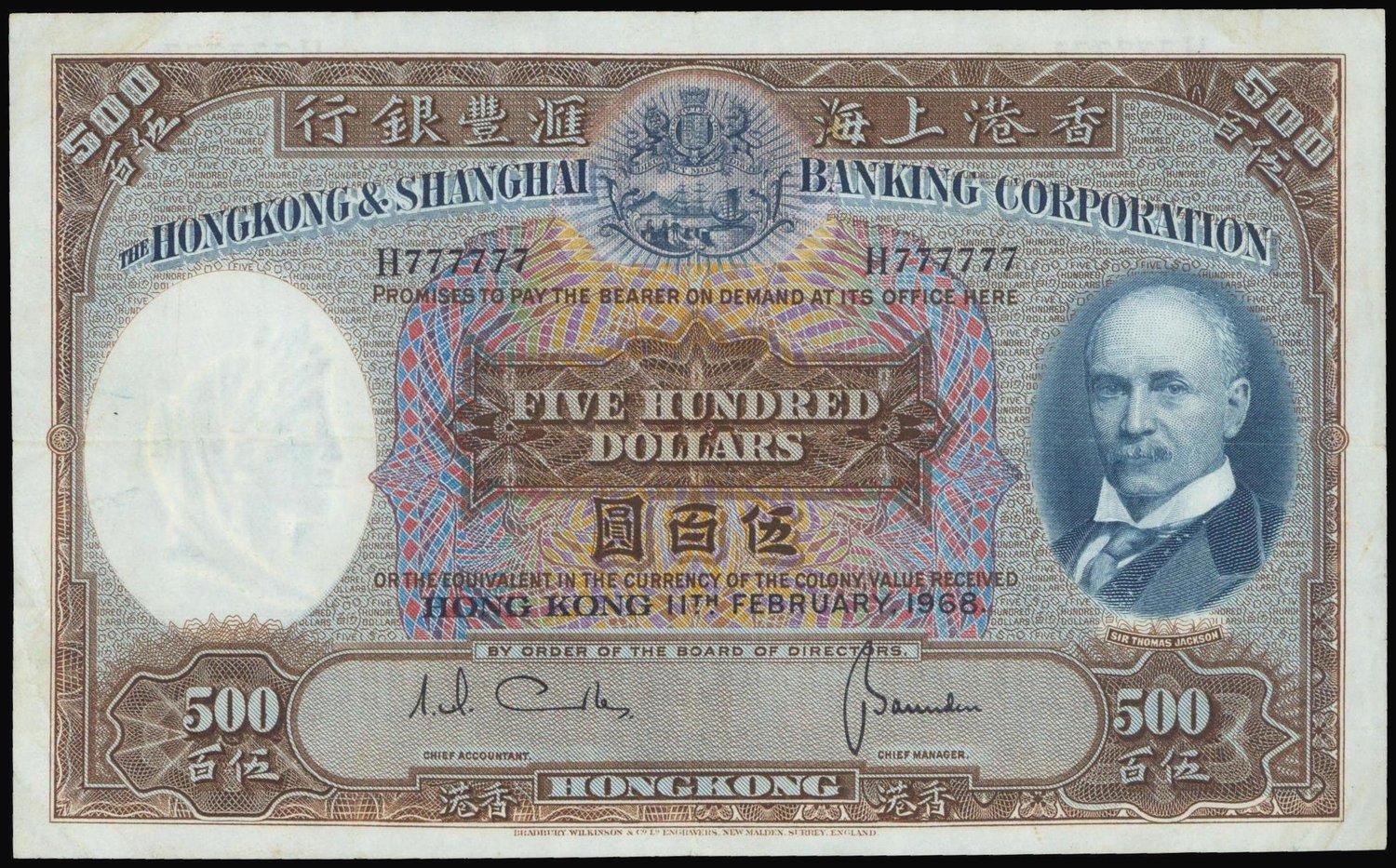 The HongKong and Shanghai Banking Corporation, $500, 1968, lucky serial number H777777, brown, blue and multicolour, Sir Thomas Jackson at right, watermark at left, reverse blue, old bank building at centre,