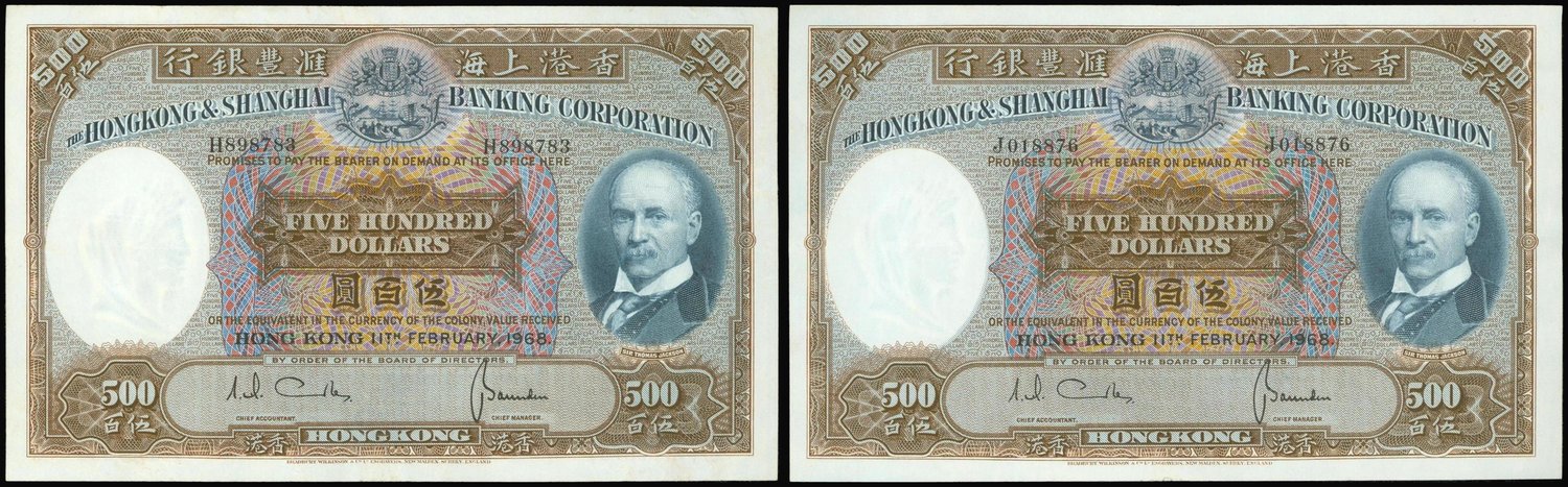 The HongKong and Shanghai Banking Corporation, pair of $500, 1968, serial numbers H898783 and J018876, brown, blue and multicoloured, Sir Thomas Jackson at right, coat of arms top centre, watermark of a woman in classical style at left, reverse blue, bust of woman at left and old HSBC building at centre,