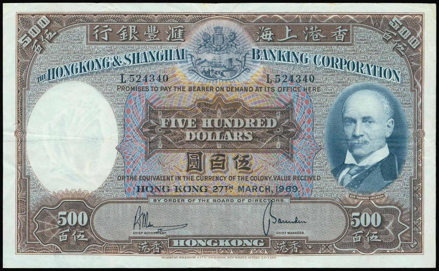 The HongKong and Shanghai Banking Corporation, $500, 1969, serial number L524340, brown, blue and multicoloured, Sir Thomas Jackson at right, coat of arms top centre, watermark of a woman in classical style at left, reverse blue, bust of woman at left and old HSBC building at centre,