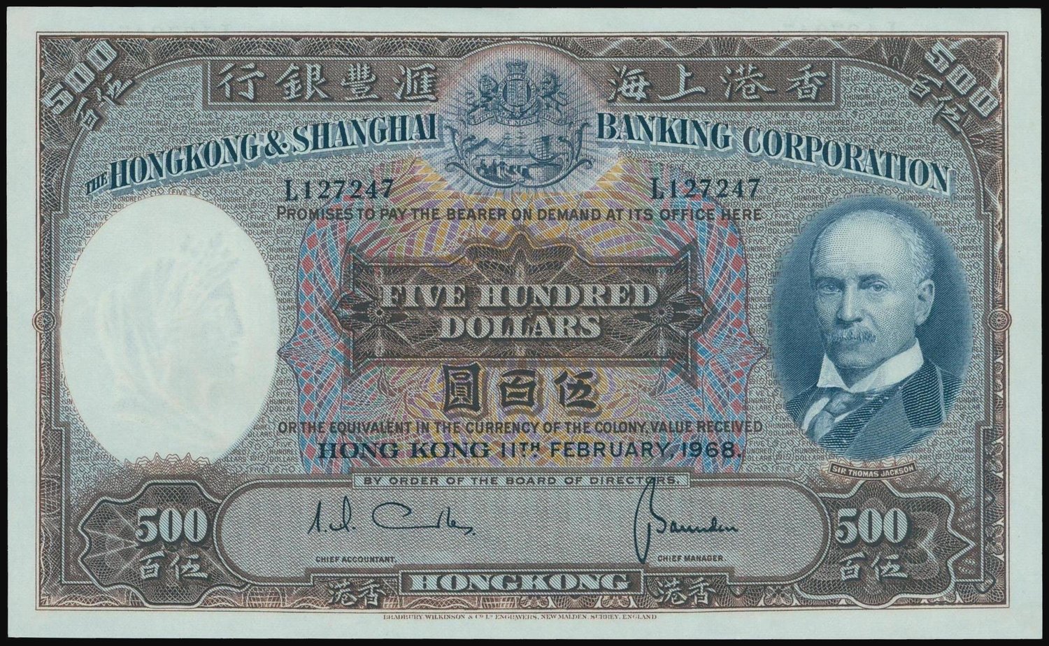 The HongKong and Shanghai Banking Corporation, $500, 1968, serial number L127247, brown, blue and multicoloured, Sir Thomas Jackson at right, coat of arms top centre, watermark of a woman in classical style at left, reverse blue, bust of woman at left and old HSBC building at centre,