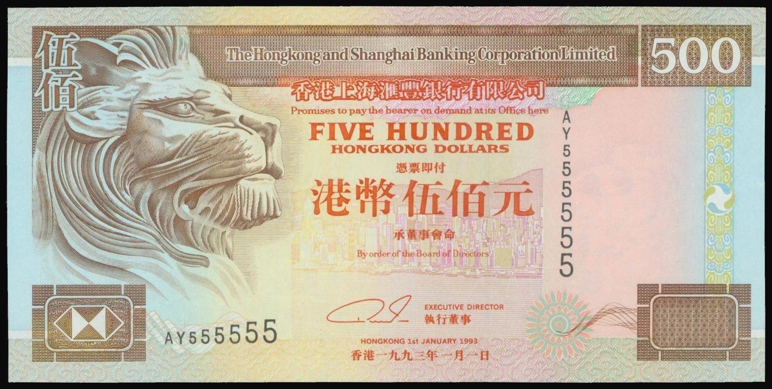 The HongKong and Shanghai Banking Corporation, $500, 1993, lucky serial number AY555555, brown, blue and multicoloured, lion at left, view of Victoria Harbour at centre, reverse brown with two lions flanking the HSBC building,