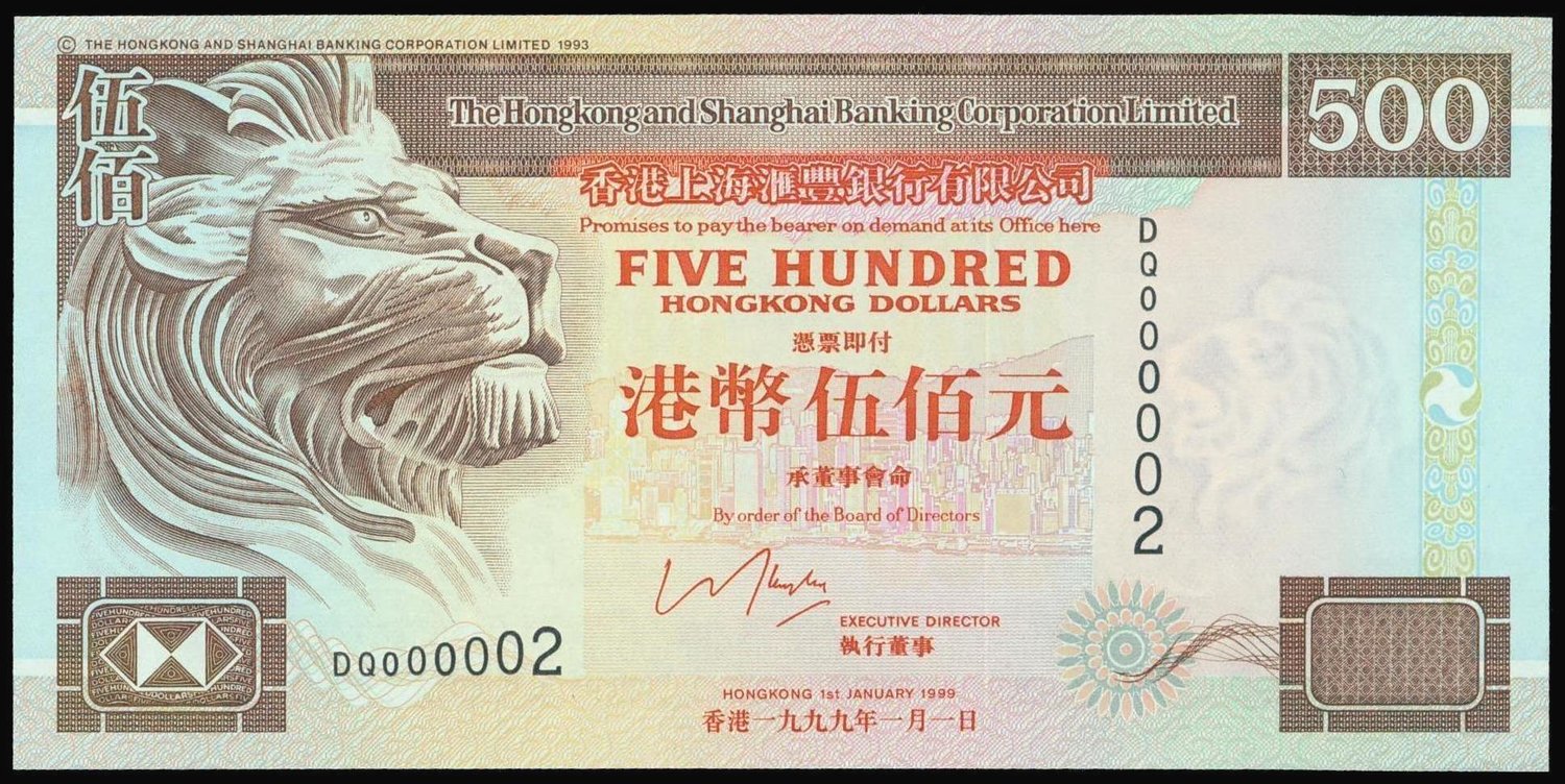 The HongKong and Shanghai Banking Corporation, $500, 1999, low serial number DQ000002, (Pick 204d), uncirculated