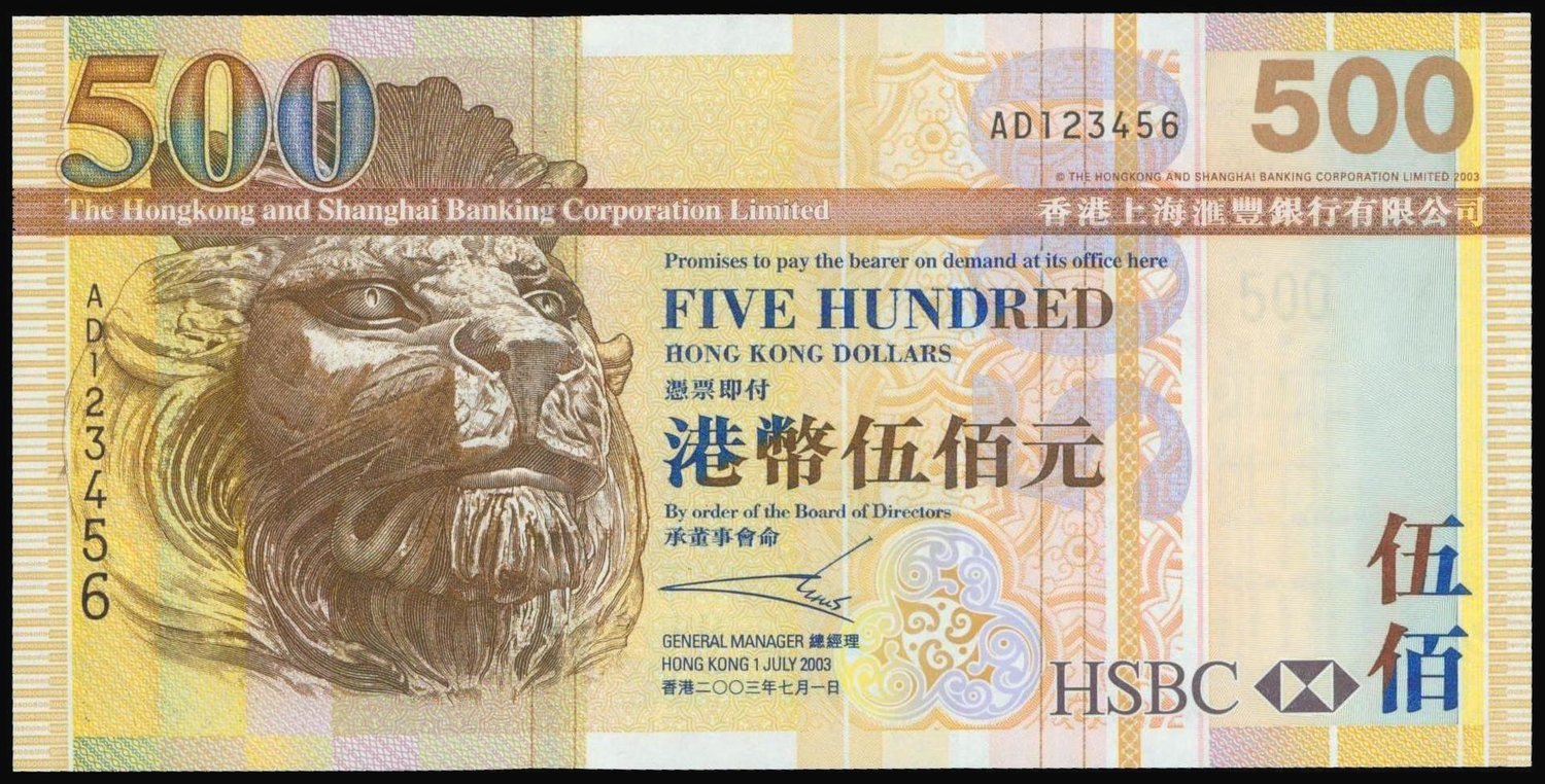 The HongKong and Shanghai Banking Corporation, $500, 2003, lucky ascending ladder serial number AD123456, brown and multicoloured, lion at left, reverse brown, Chek Lap Kok airport,